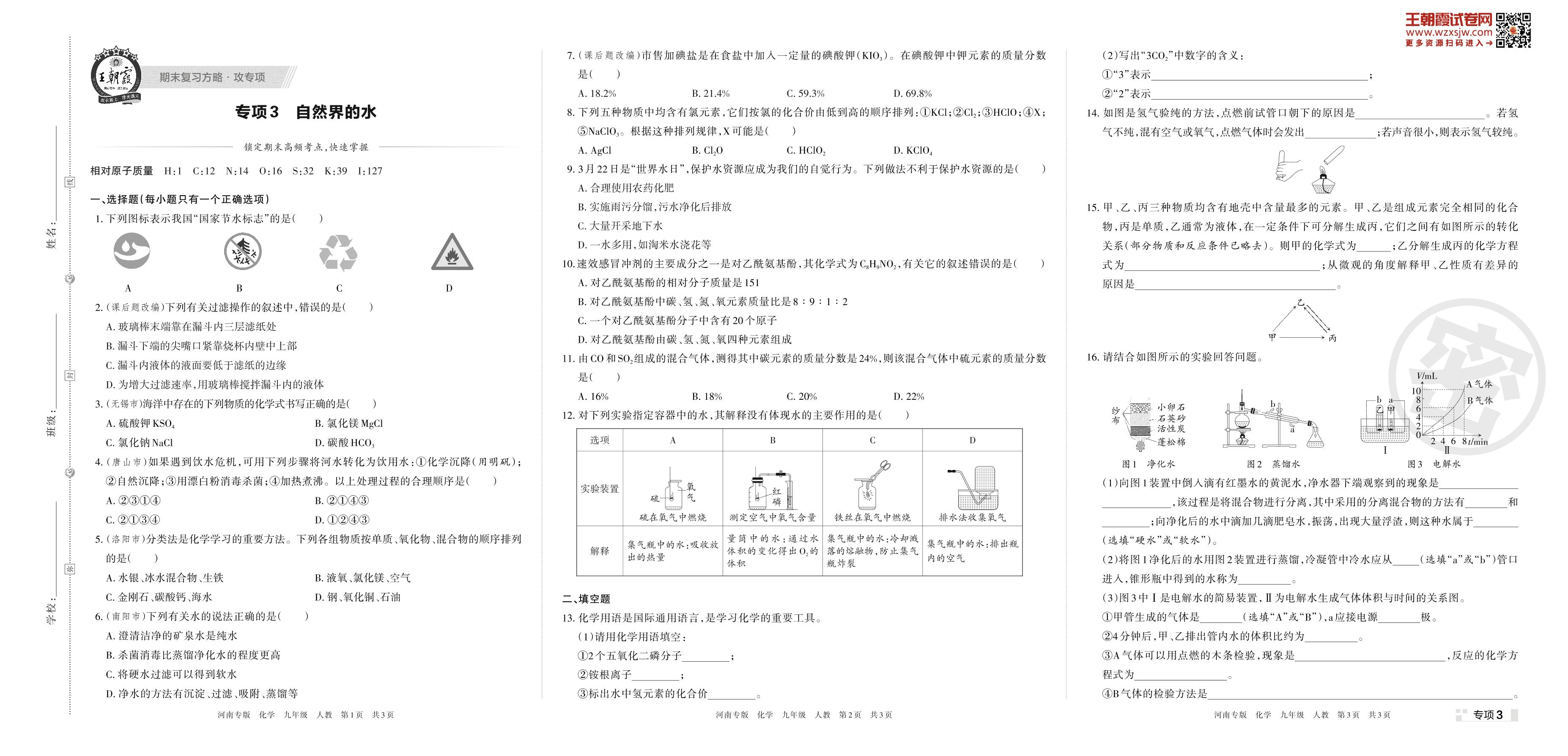 王朝霞期末专项卷——自然界的水九年级上册化学(人教版)【3】