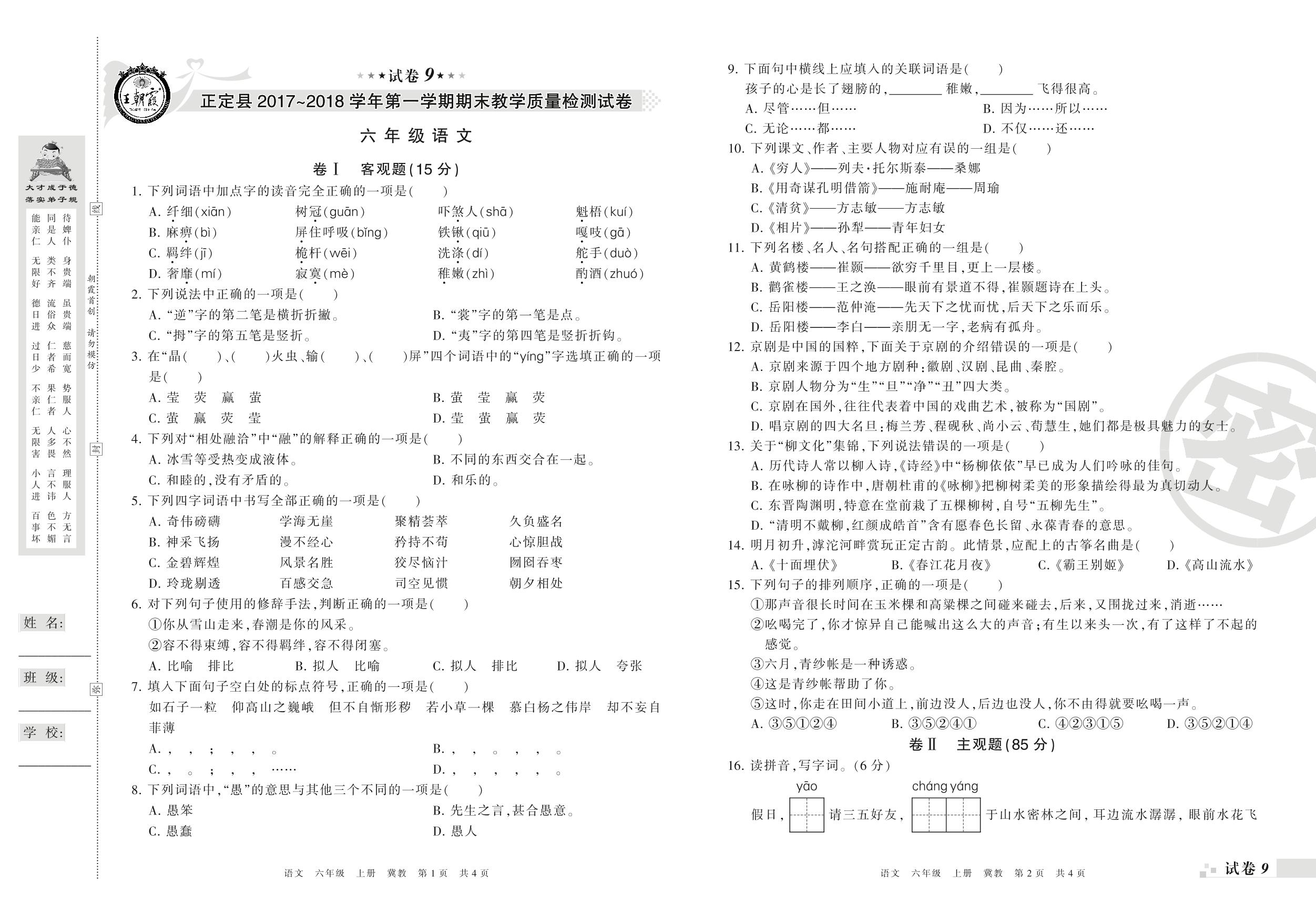 2017-2018学年第一学期石家庄市正定县六年级语文试卷(冀教版)【9】