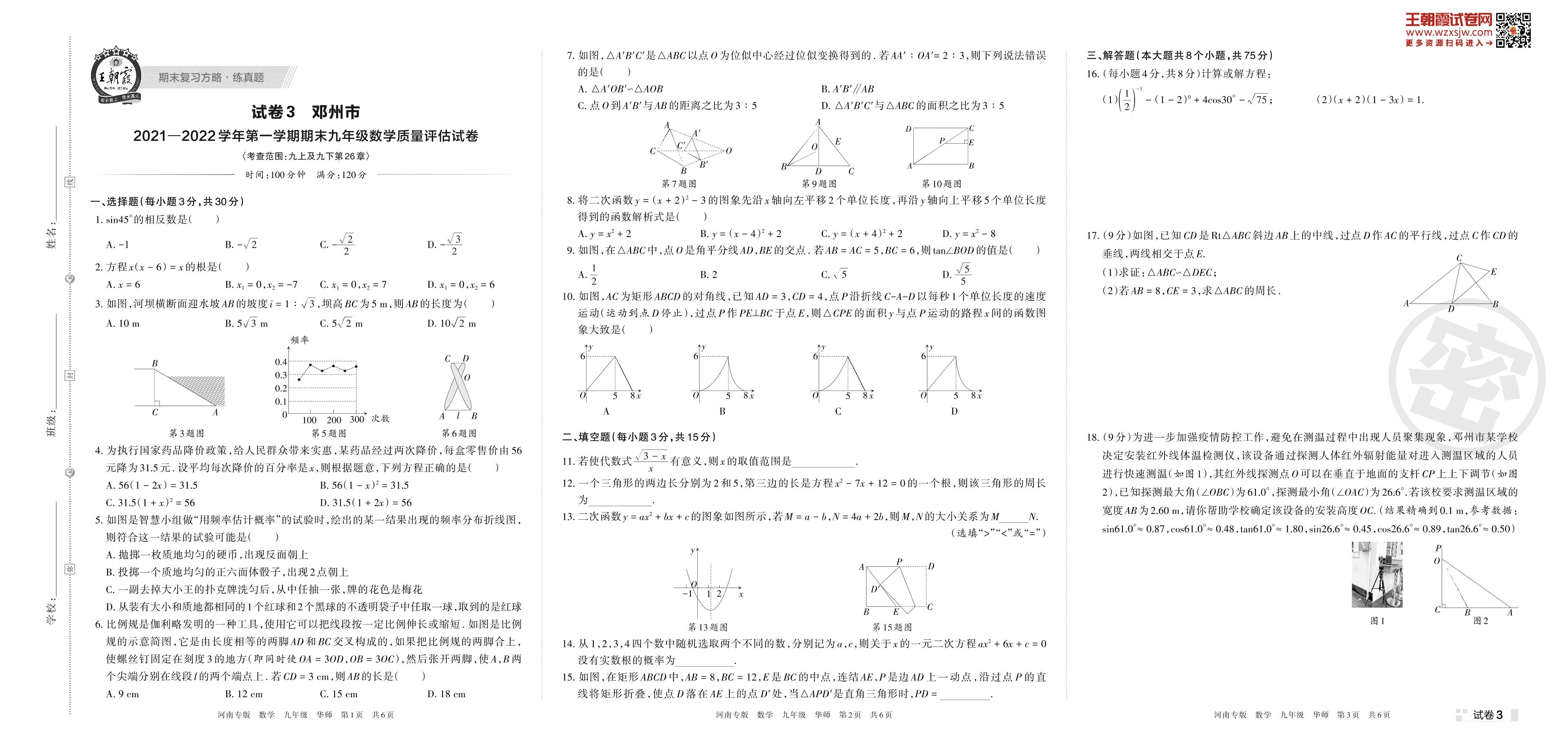 邓州市2021—2022学年第一学期期末九年级数学质量评估试卷(华师版)【3】