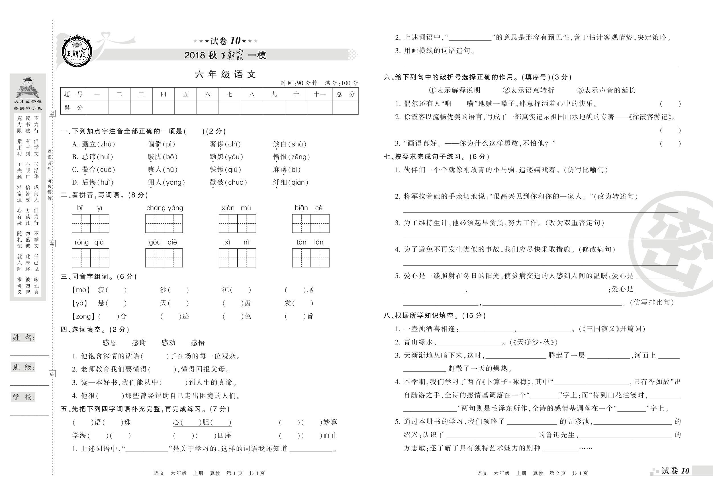 王朝霞期末模拟卷六年级上册语文(冀教版)【10】
