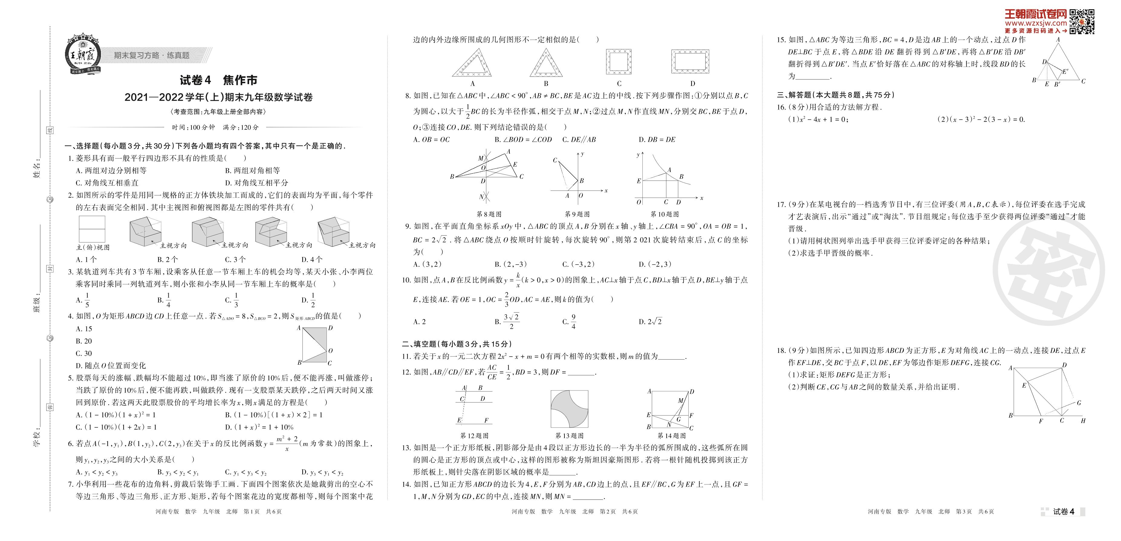 焦作市2021—2022学年(上)期末九年级数学试卷(北师版)【4】
