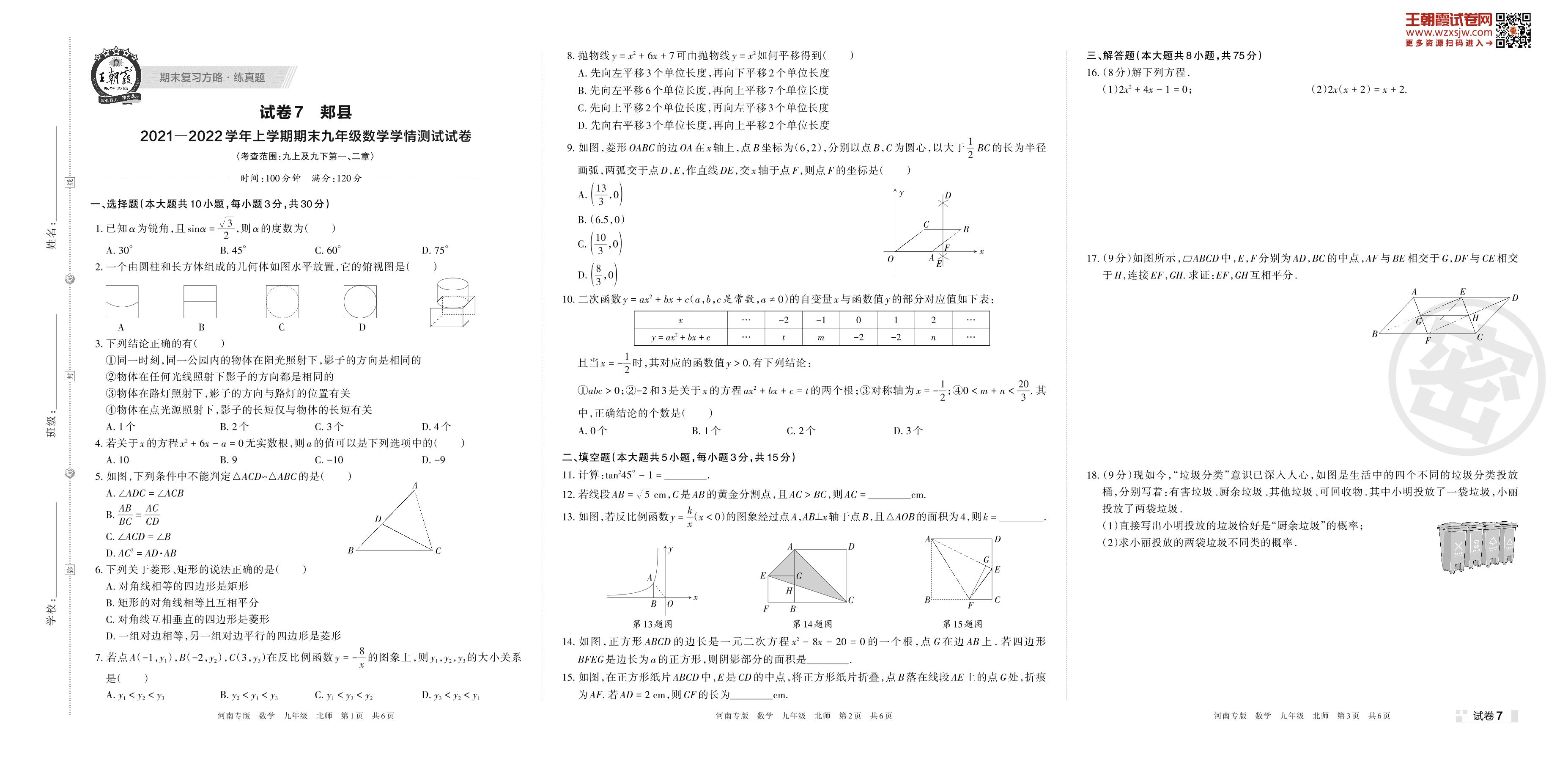 郏县2021—2022学年上学期期末九年级数学学情测试试卷(北师版)【7】