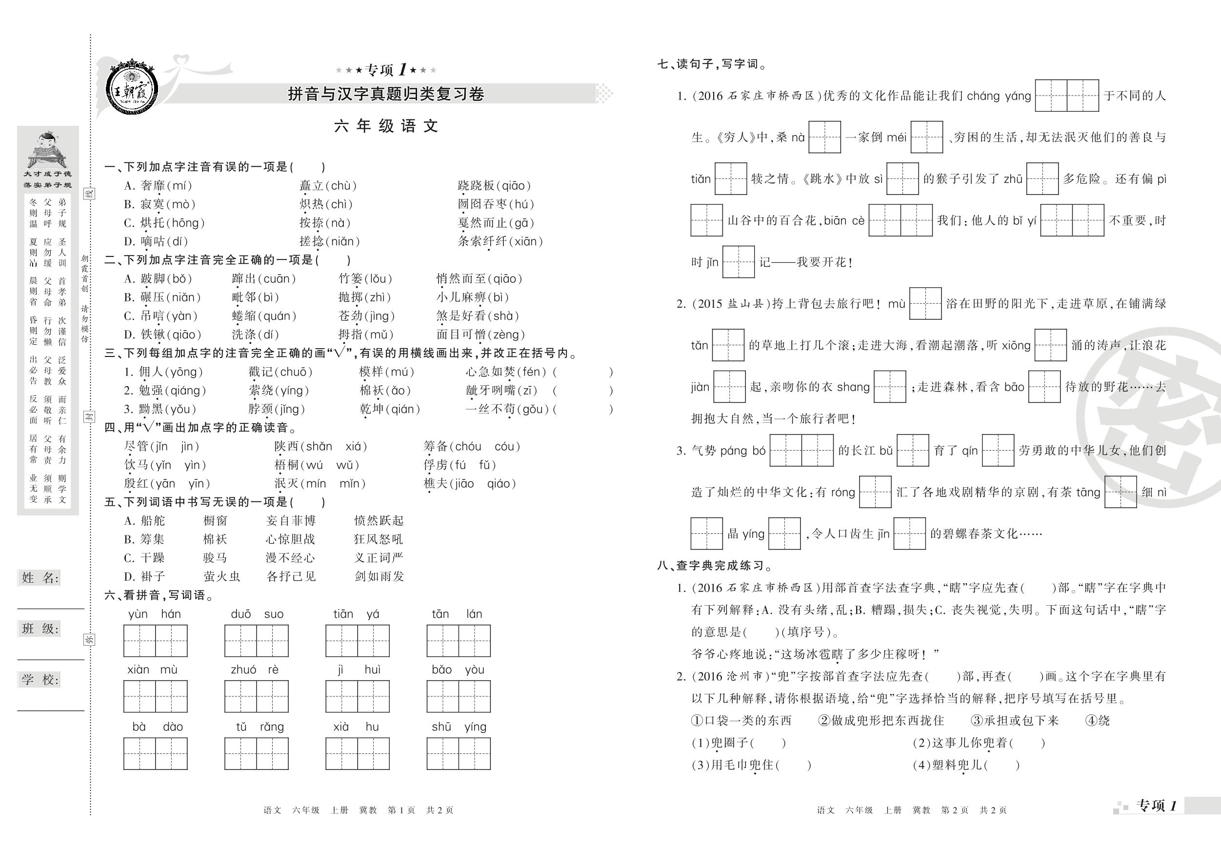 王朝霞期末专项卷——拼音与汉字、词语真题归类复习卷六年级上册语文(冀教版)_R210802115105【0】