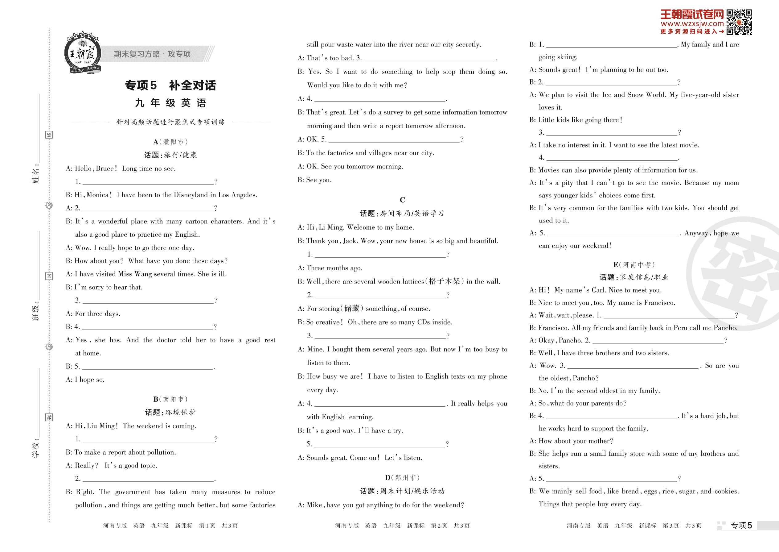 王朝霞期末专项卷——补全对话九年级上册英语(新课标)【5】