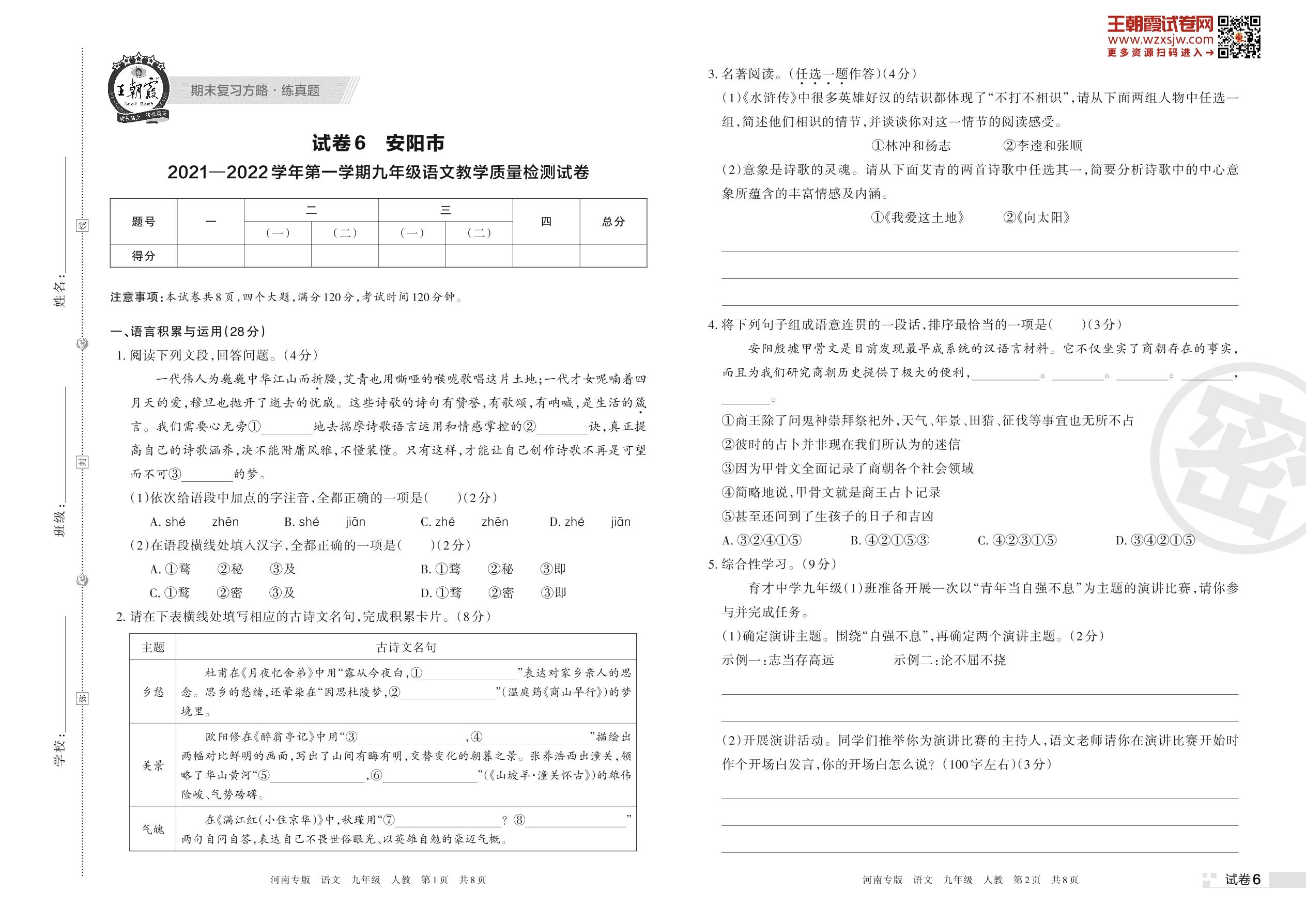 安阳市2021—2022学年第一学期九年级语文教学质量检测试卷(人教版)【6】
