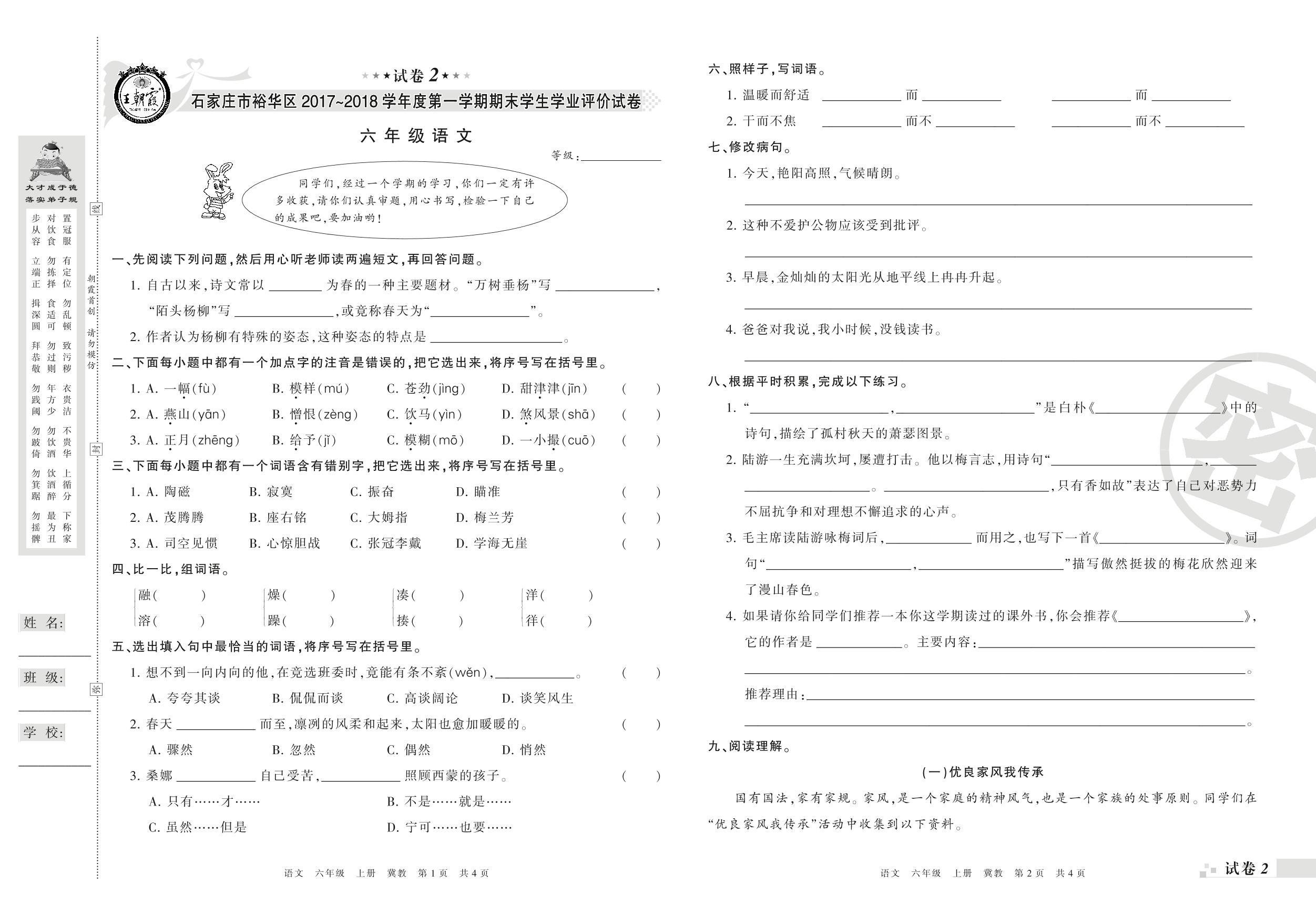 2017-2018学年第一学期石家庄市裕华区六年级语文试卷(冀教版)【2】