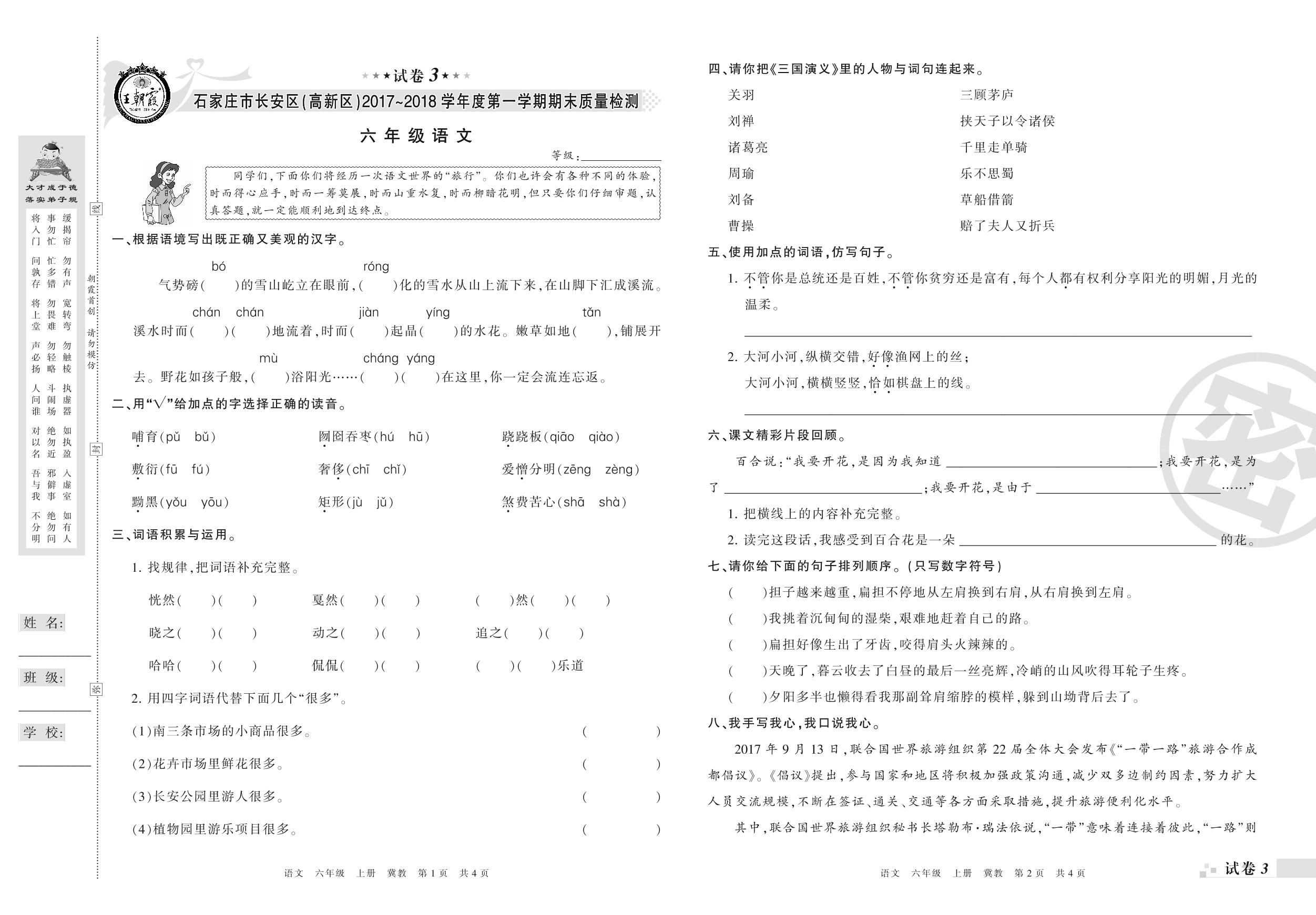 2017-2018学年第一学期石家庄市长安区、高新区六年级语文试卷(冀教版)【3】