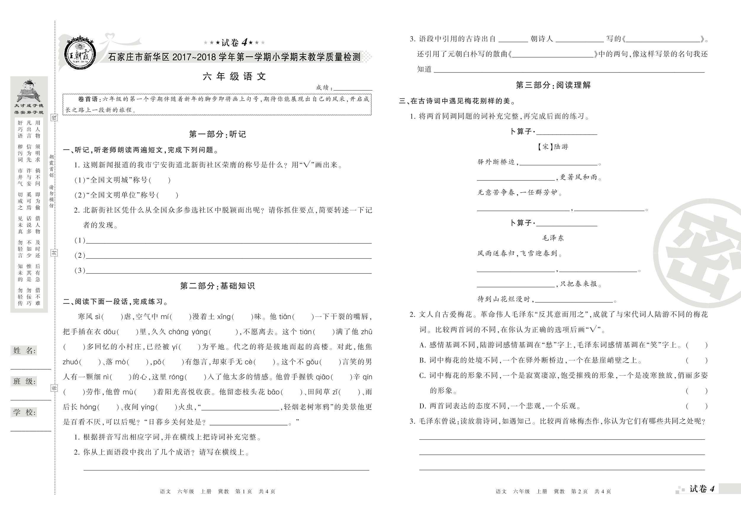 2017-2018学年第一学期石家庄市新华区六年级语文试卷(冀教版)【4】
