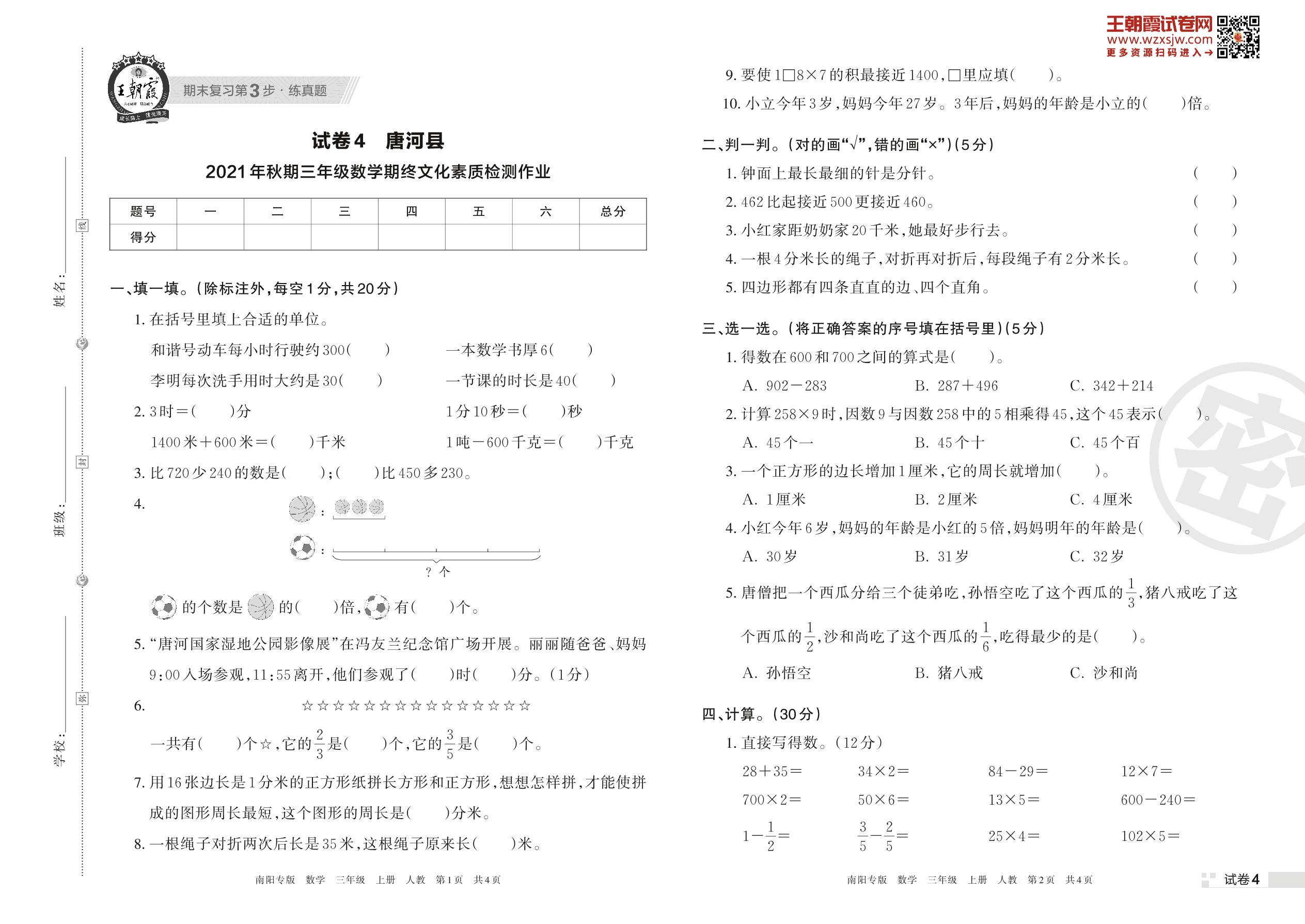 唐河县2021年秋期三年级数学期终文化素质检测作业(人教版)【4】