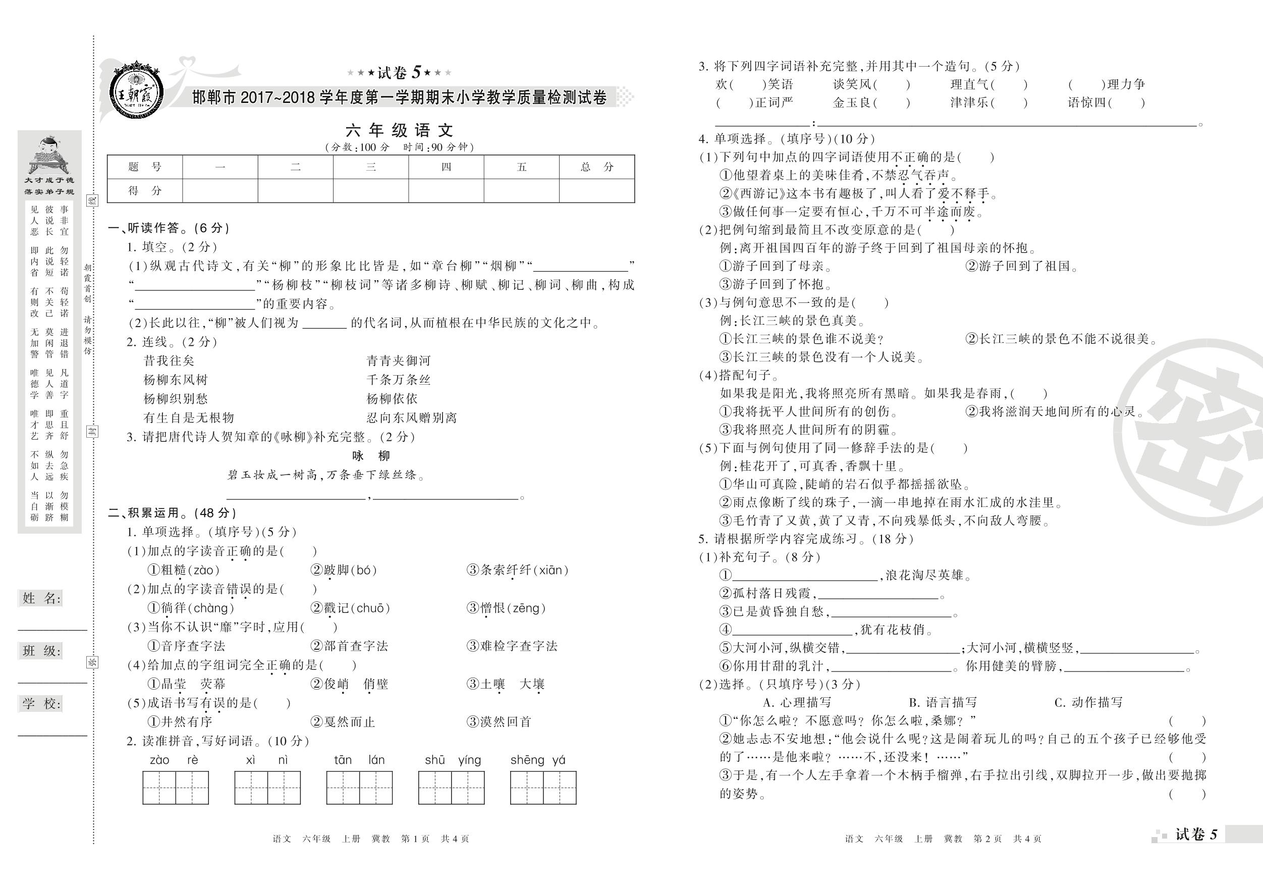 2017-2018学年第一学期邯郸市六年级语文试卷(冀教版)【5】