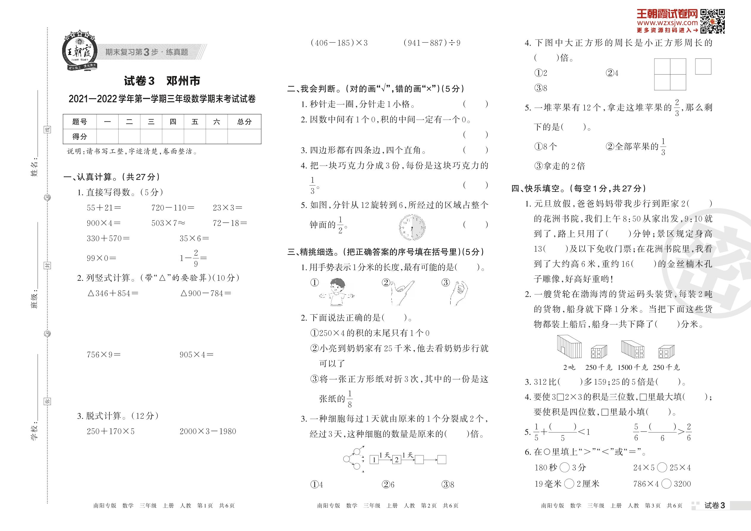 邓州市2021—2022学年第一学期三年级数学期末考试试卷(人教版)【3】