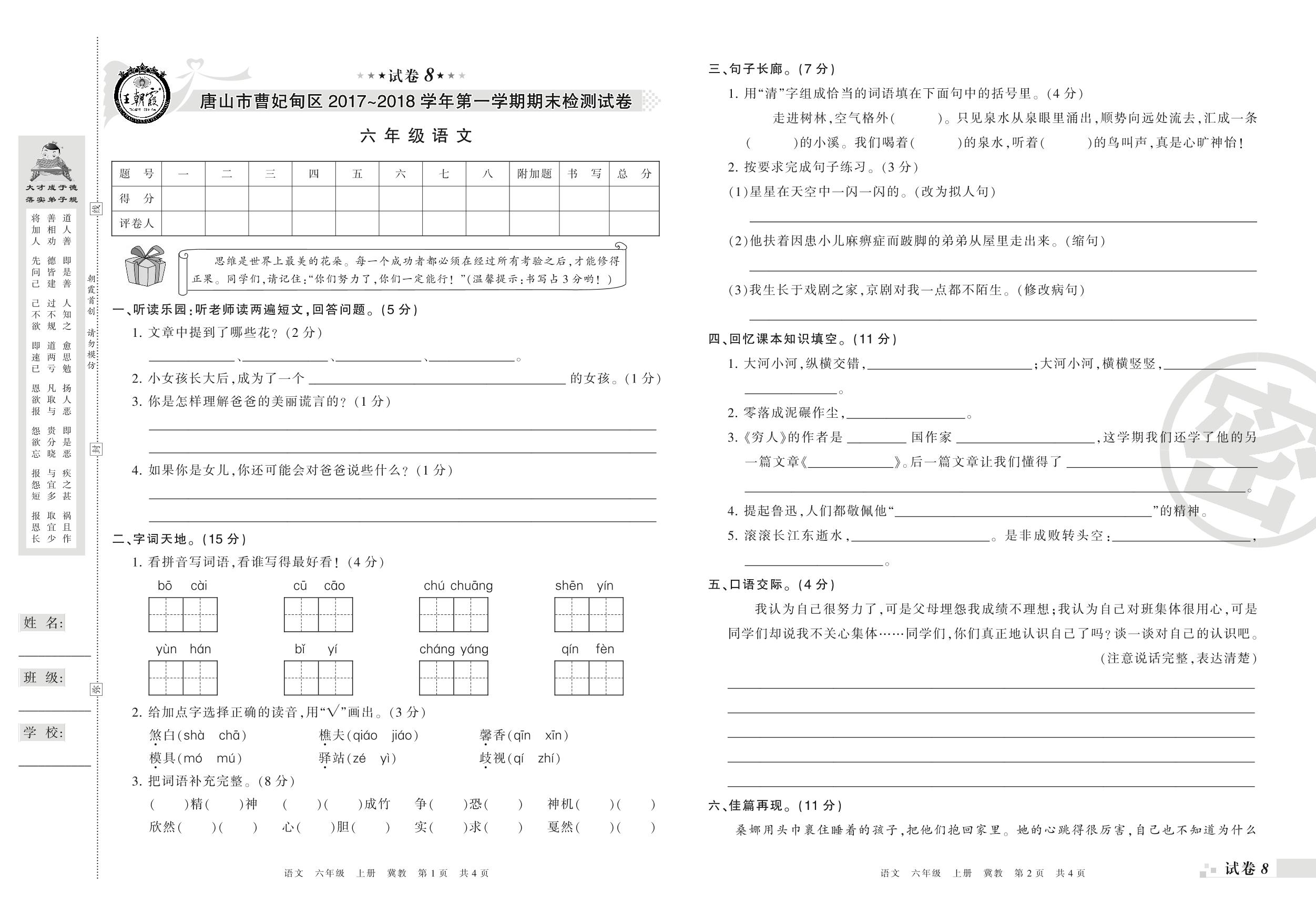 2017-2018学年第一学期唐山市曹妃甸区六年级语文试卷(冀教版)【8】