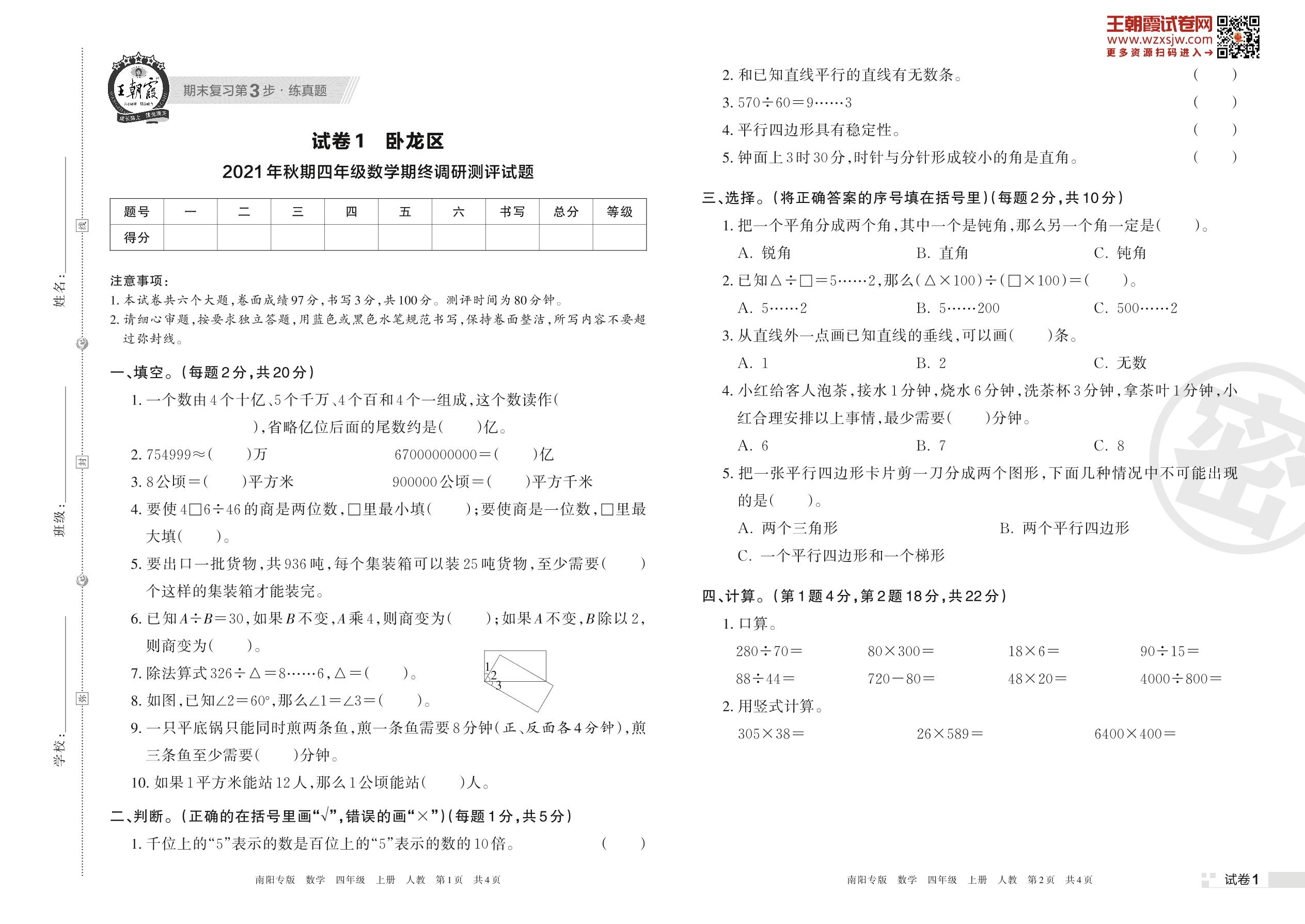 卧龙区2021年秋期四年级数学期终调研测评试题(人教版)【1】