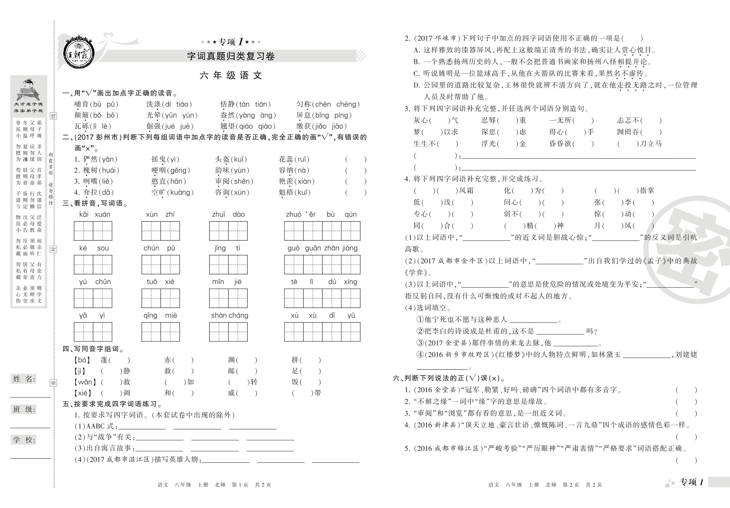 王朝霞期末专项卷——字词、句子与语言表达真题归类复习卷六年级上册语文(北师版)_R210802115200【0】