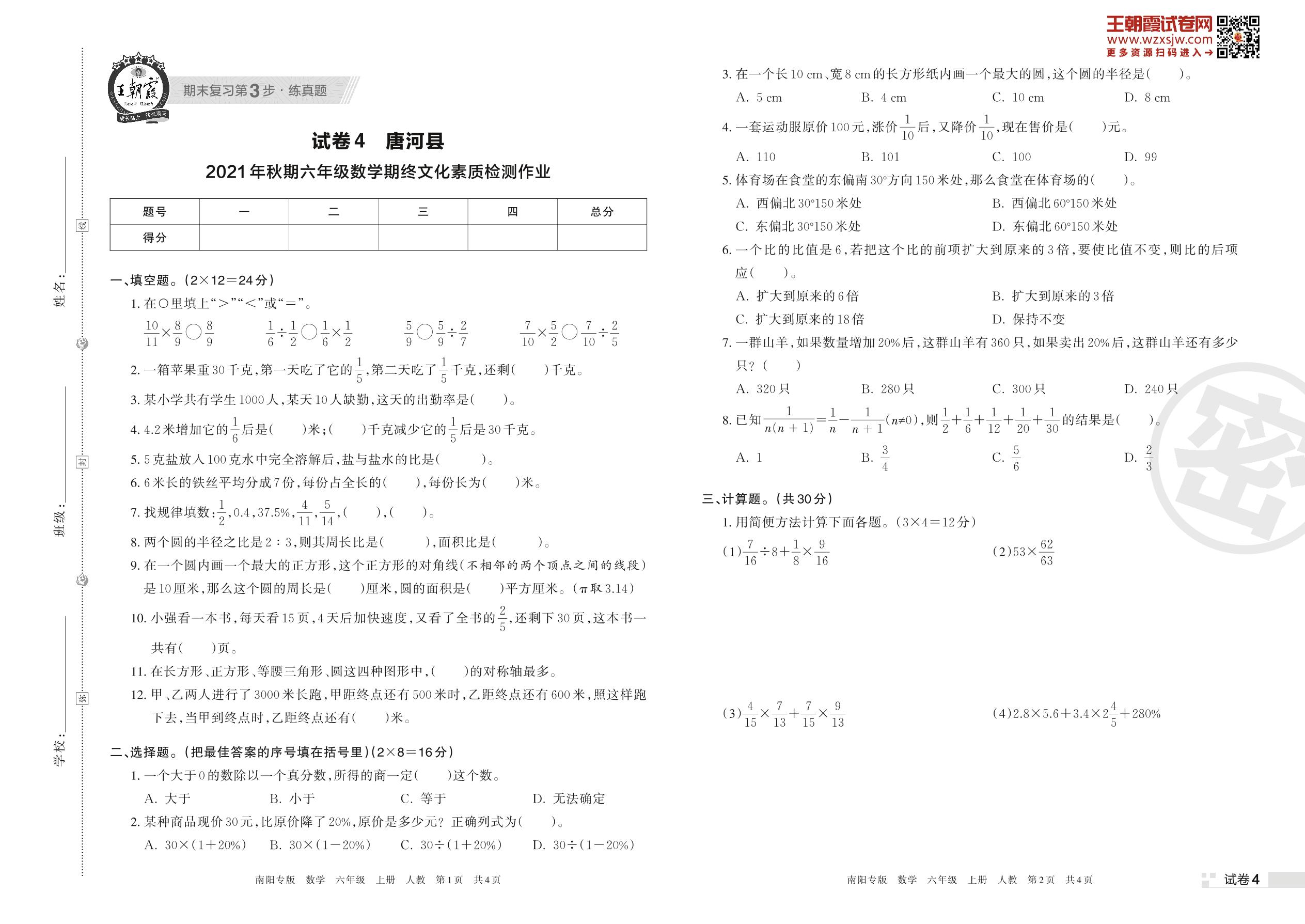 唐河县2021年秋期六年级数学期终文化素质检测作业(人教版)【4】