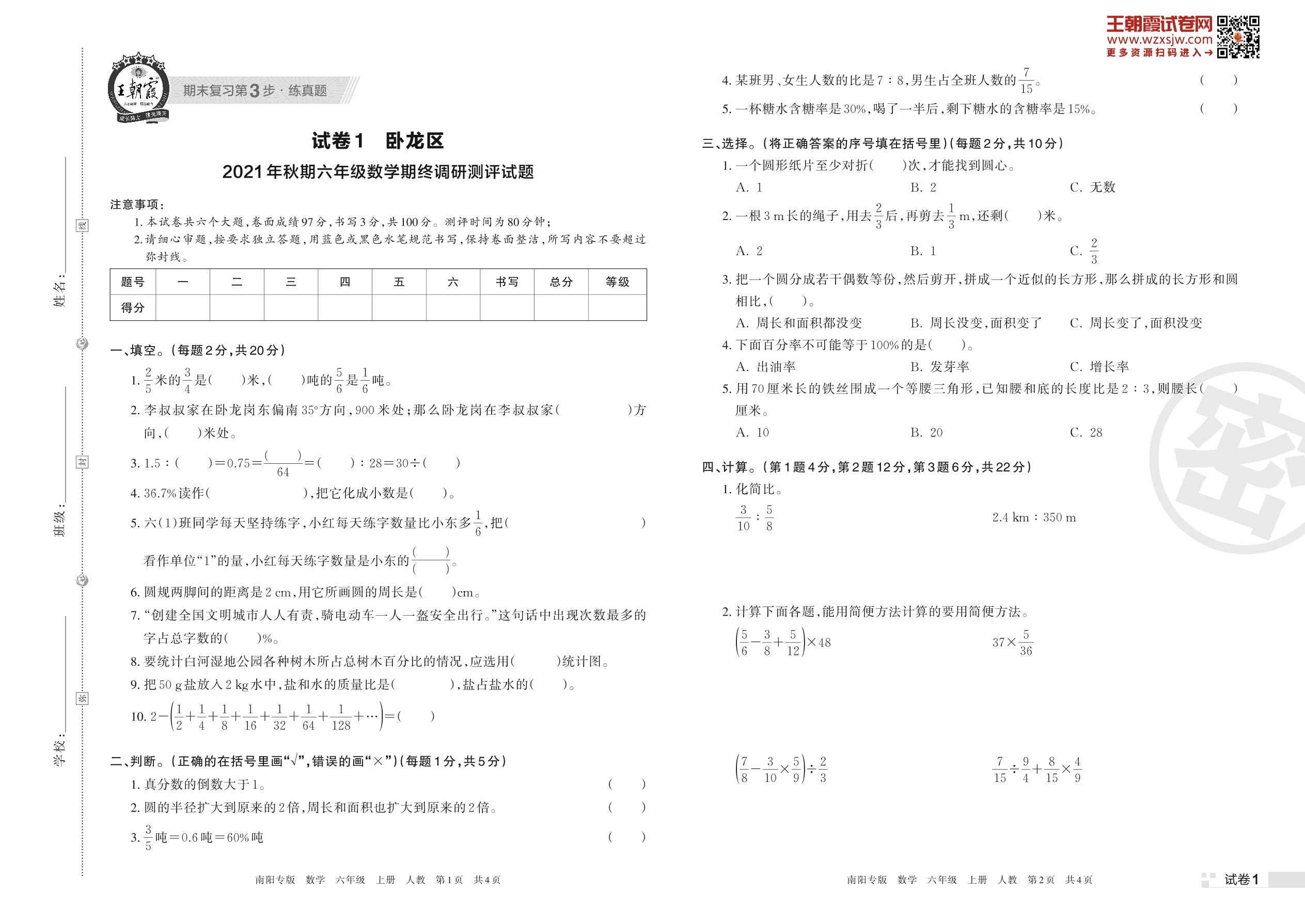 卧龙区2021年秋期六年级数学期终调研测评试题(人教版)【1】