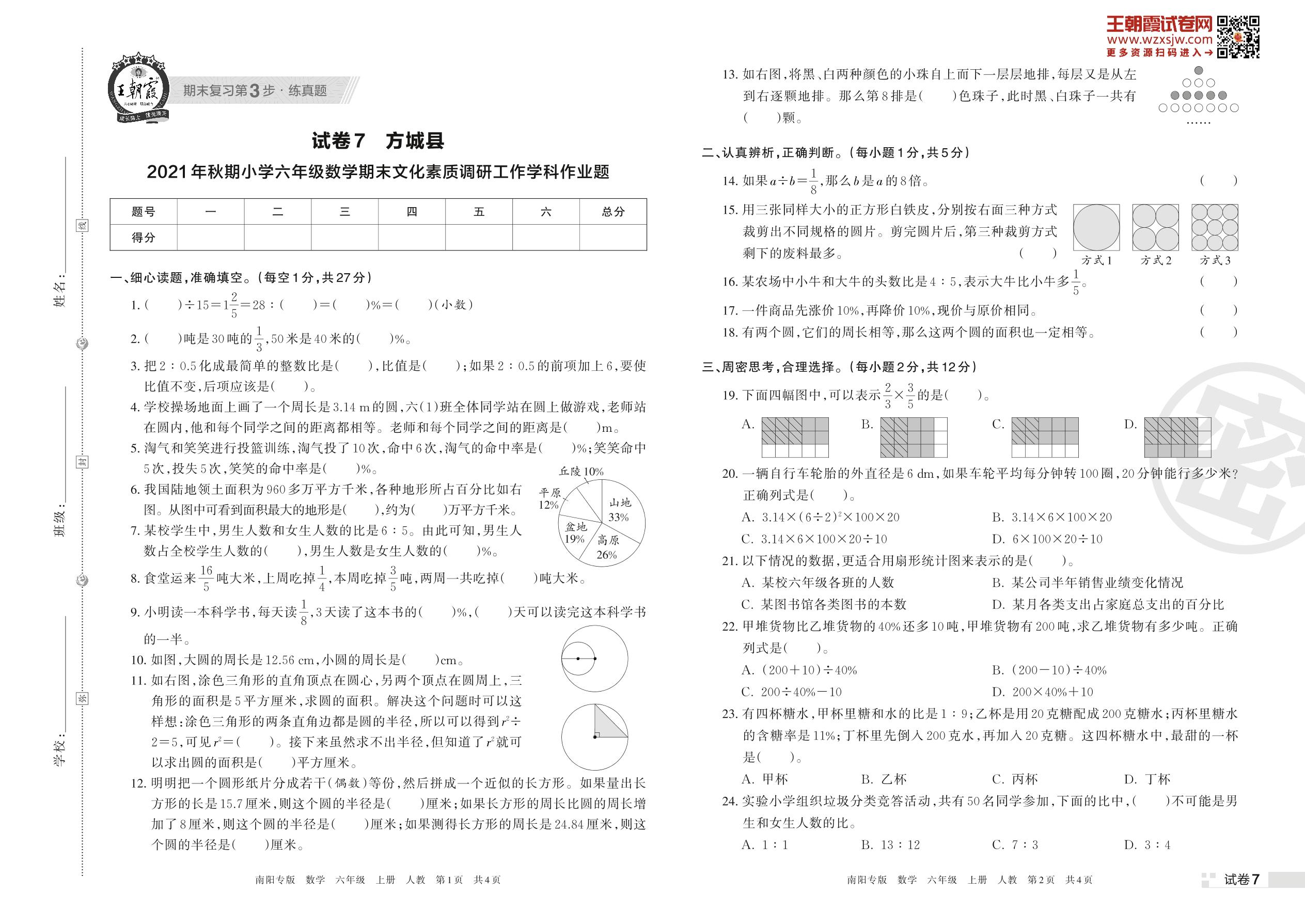 方城县2021年秋期小学六年级数学期末文化素质调研工作学科作业题(人教版)【7】