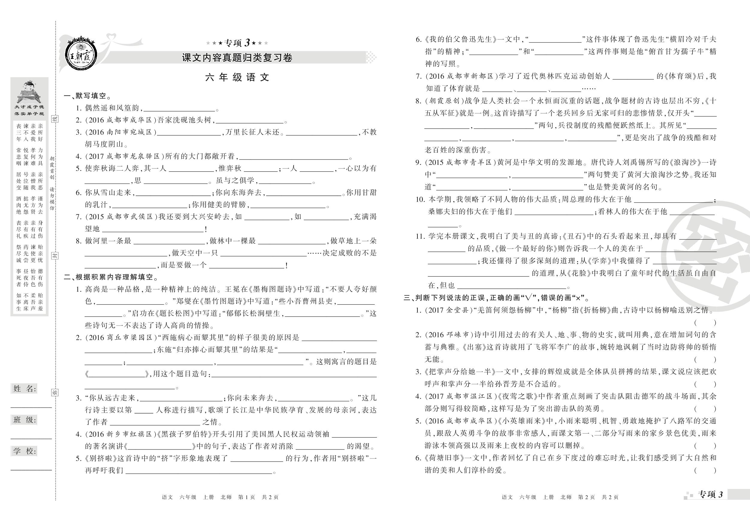 王朝霞期末专项卷——课文内容、积累运用真题归类复习卷六年级上册语文(北师版)_R210802115203【0】
