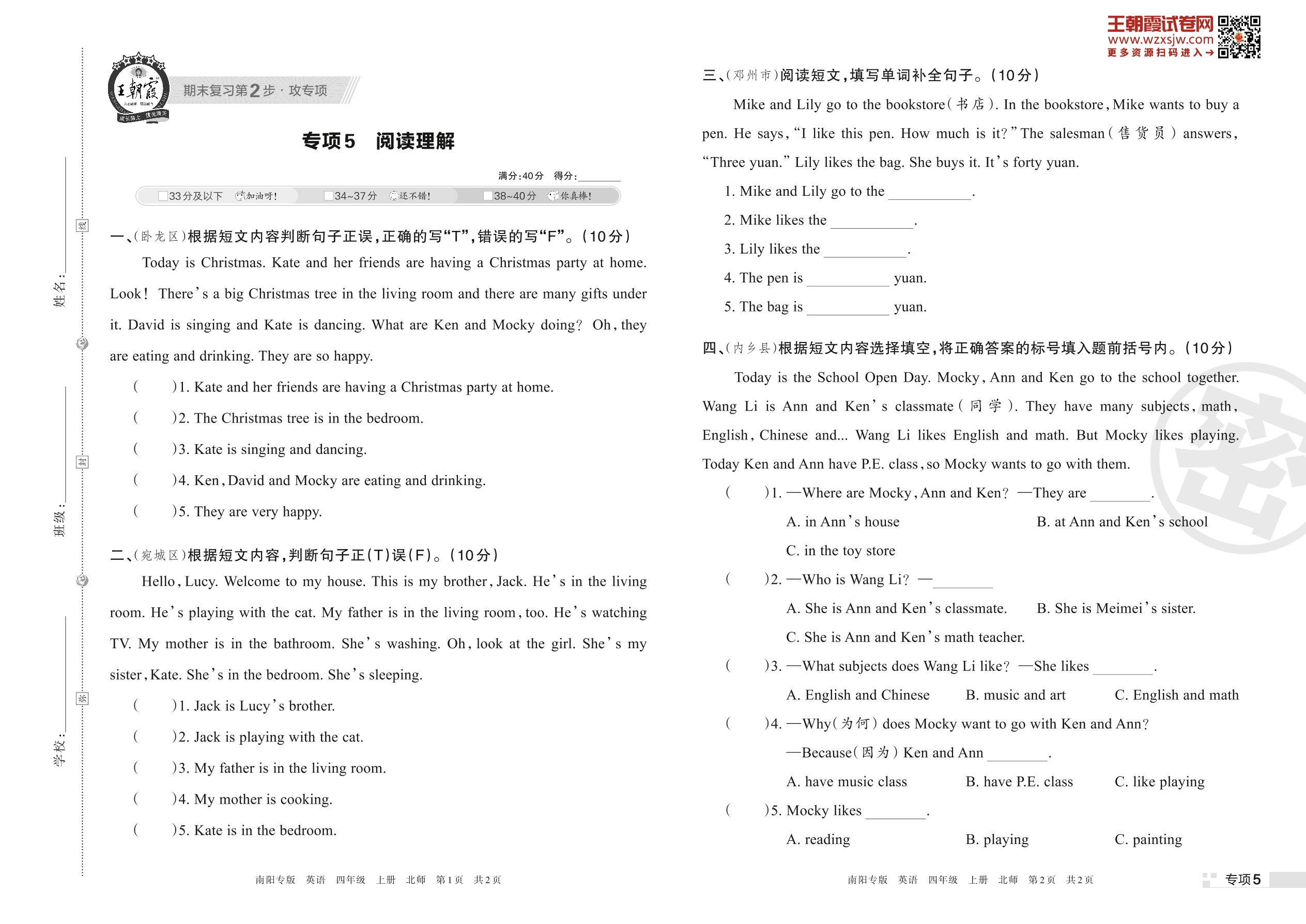 王朝霞期末专项卷——阅读理解四年级上册英语(北师版)【5】