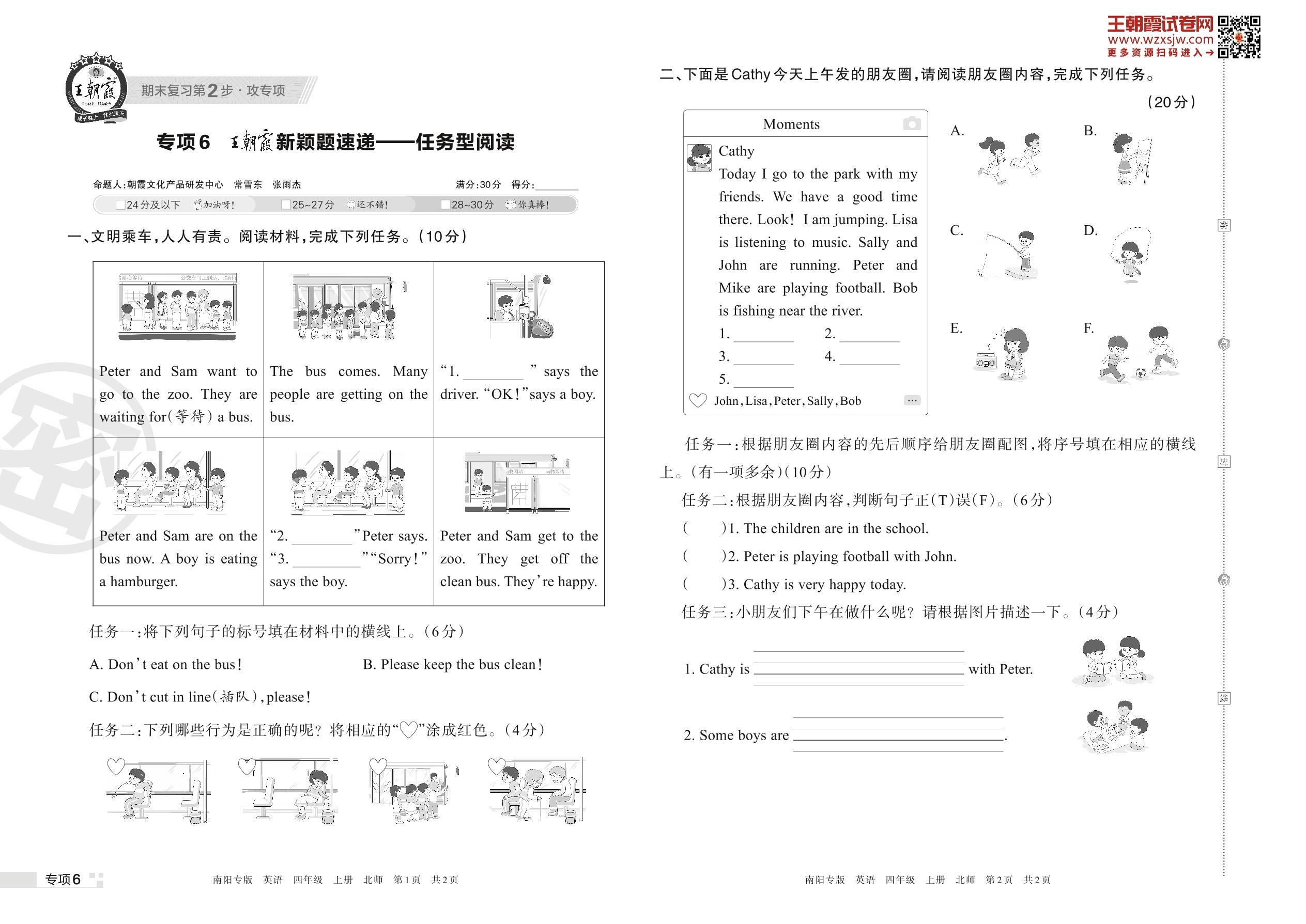 王朝霞期末专项卷——王朝霞新颖题速递:任务型阅读四年级上册英语(北师版)【6】