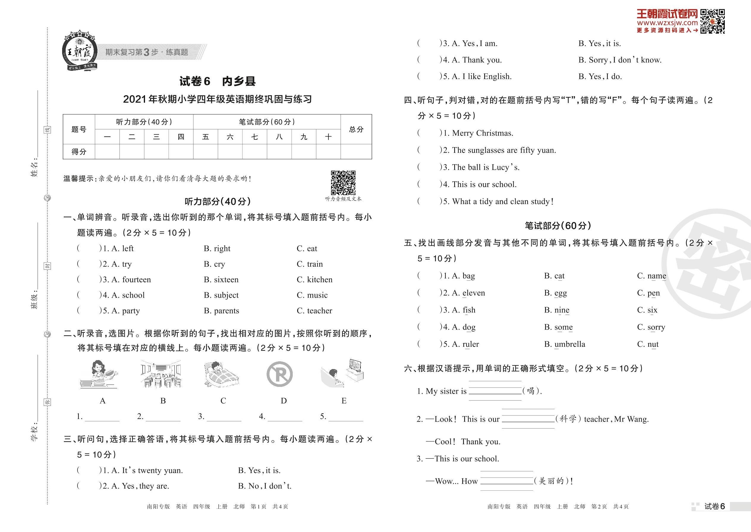 内乡县2021年秋期小学四年级英语期终巩固与练习(北师版)【6】