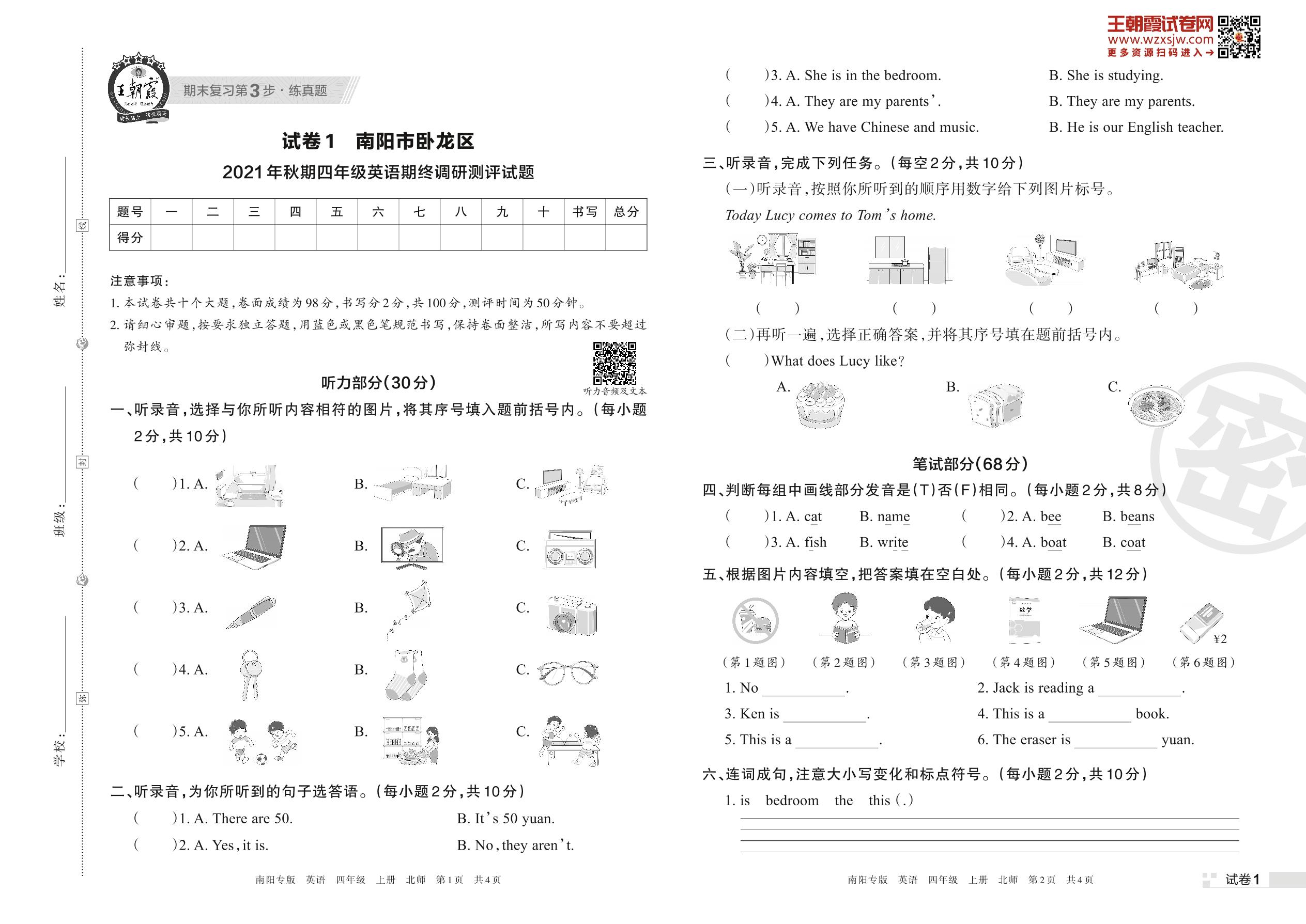 南阳市卧龙区2021年秋期四年级英语期终调研测评试题(北师版)【1】