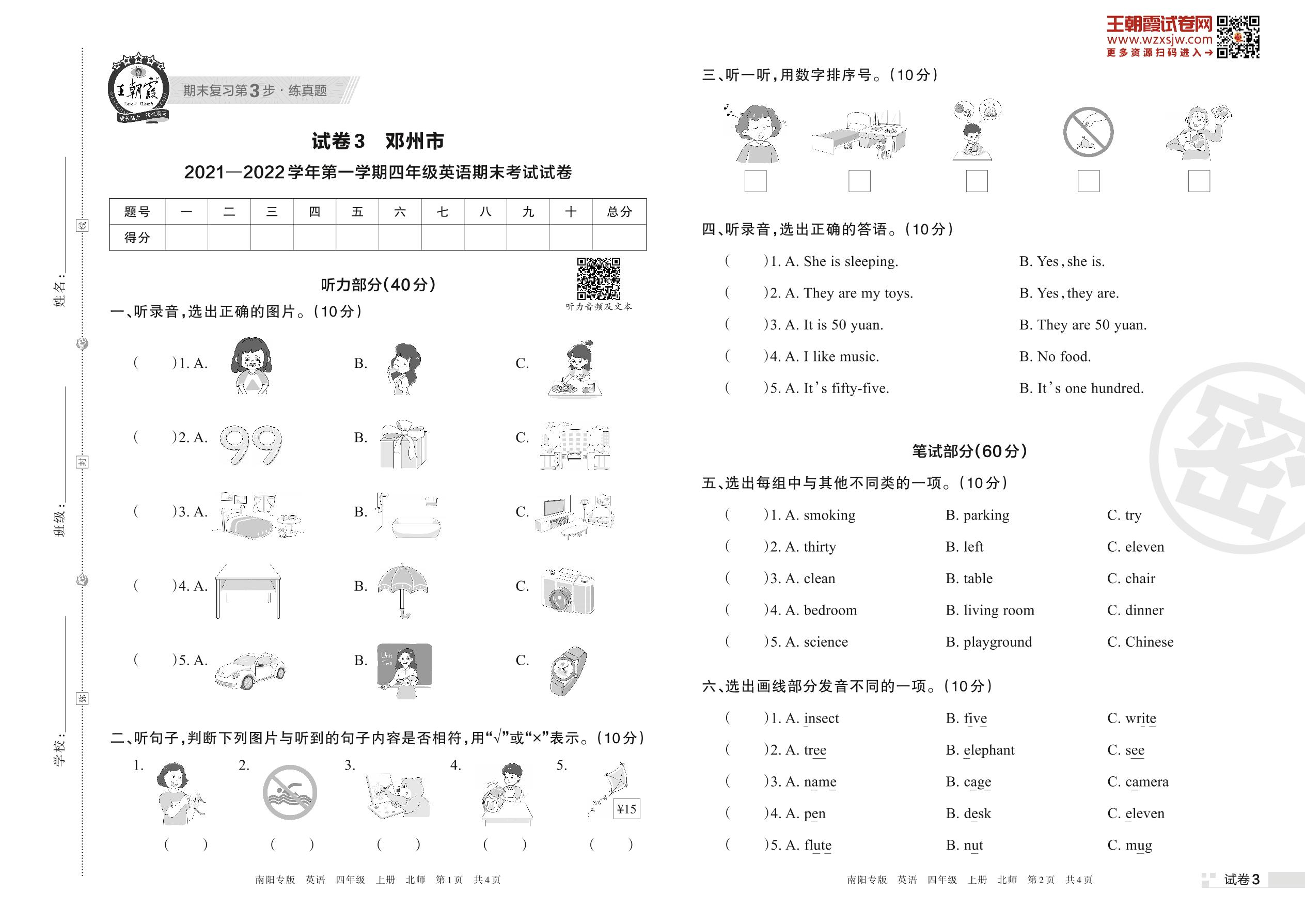 邓州市2021—2022学年第一学期四年级英语期末考试试卷(北师版)【3】