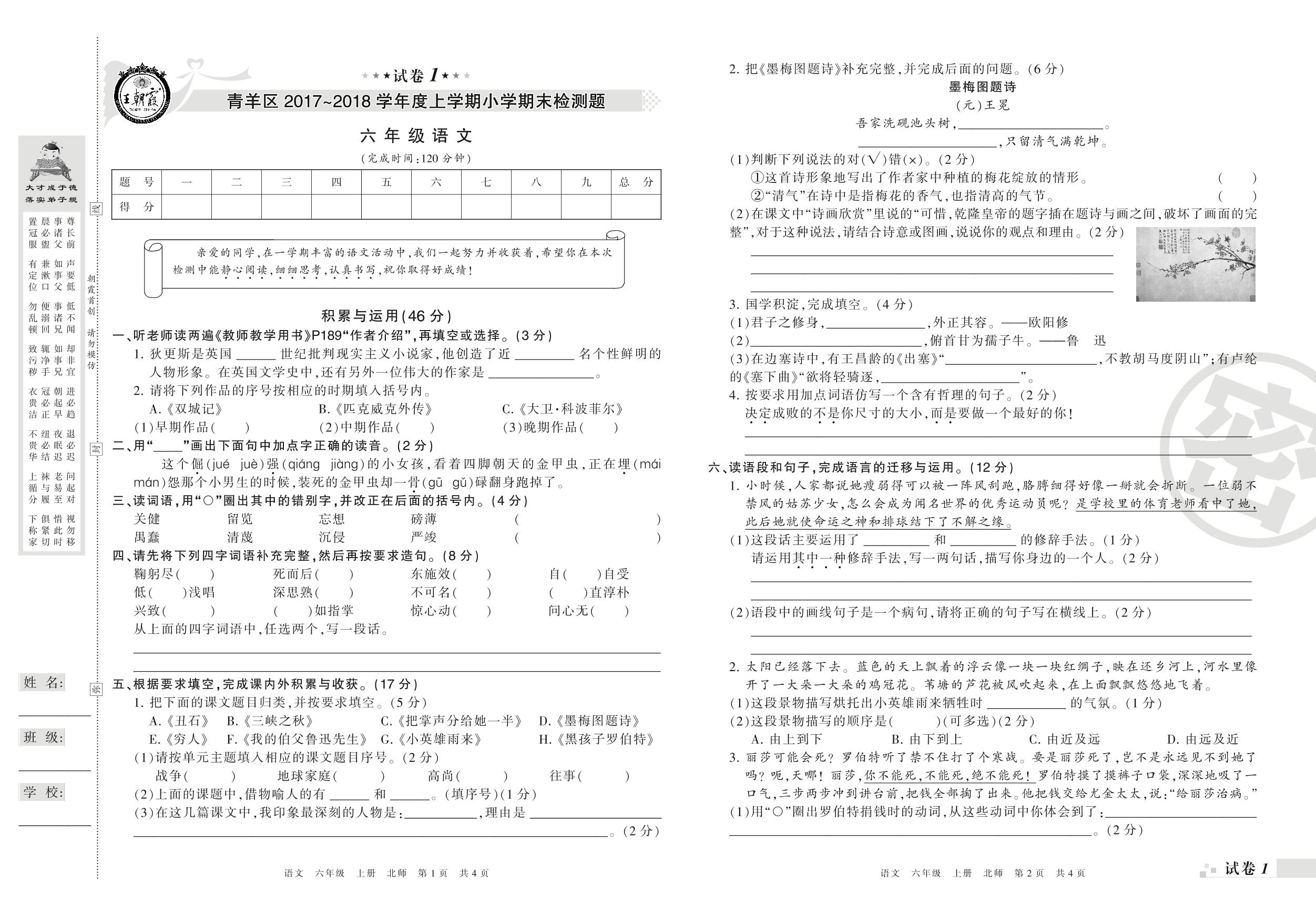 2017-2018学年第一学期成都市青羊区六年级语文试卷(北师版)【1】
