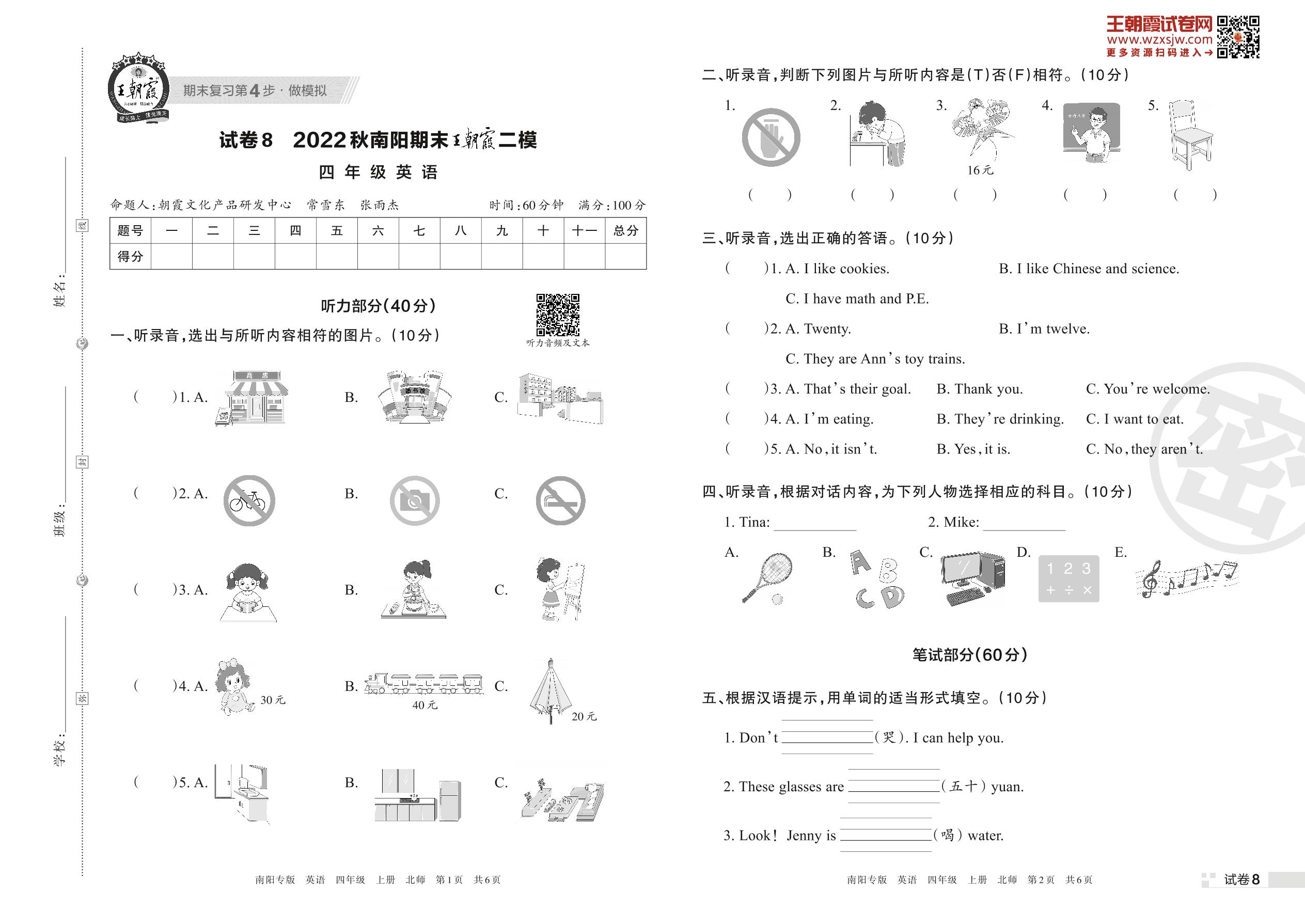 王朝霞期末模拟卷四年级上册英语(北师版)_R221123142513135【8】