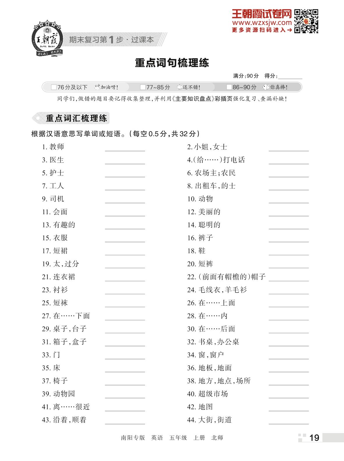 王朝霞期末过课本——重点词句梳理练五年级上册英语(北师版)