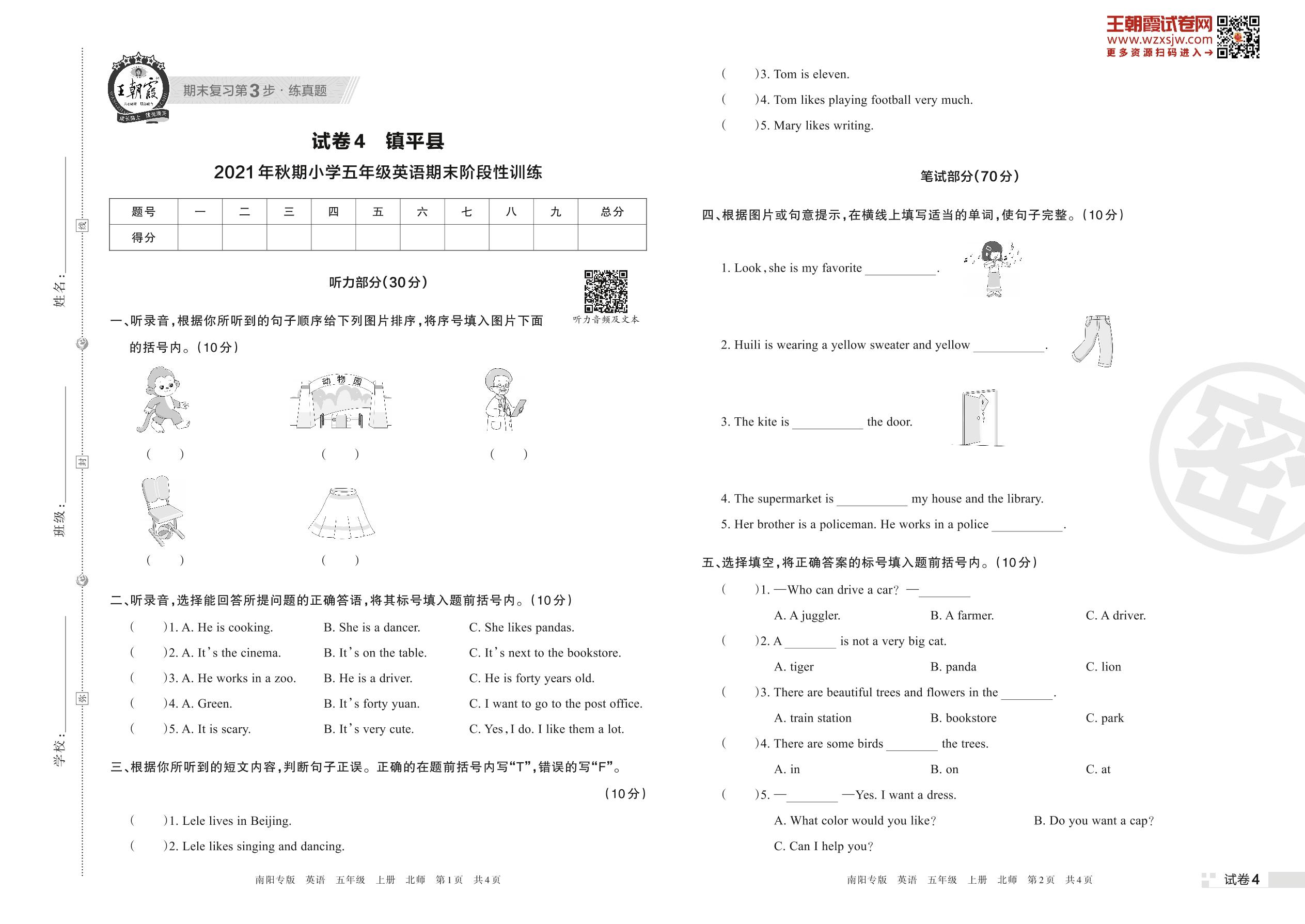 镇平县2021年秋期小学五年级英语期末阶段性训练(北师版)【4】