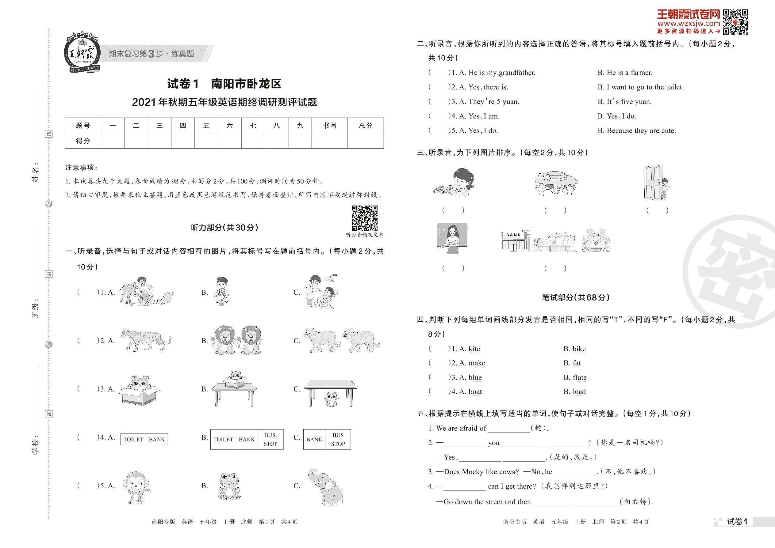 南阳市卧龙区2021年秋期五年级英语期终调研测评试题(北师版)【1】