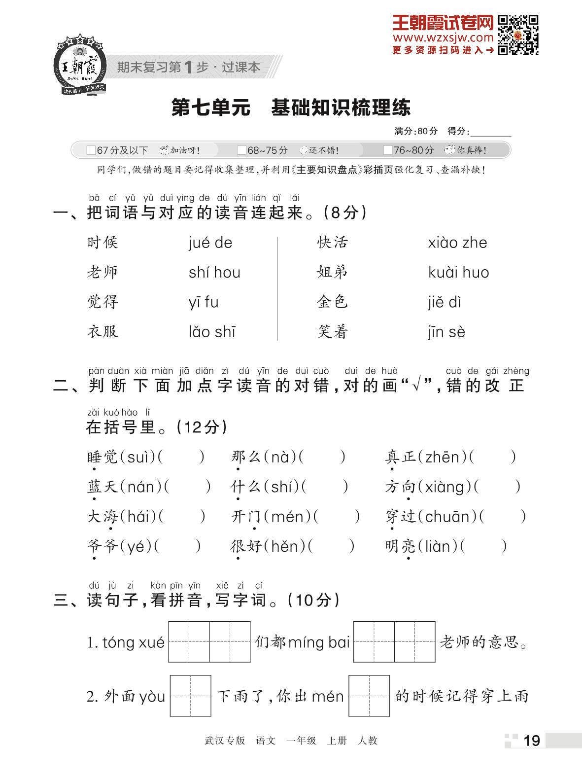 王朝霞期末过课本——第七单元 基础知识梳理练一年级上册语文(人教版)_R221123145543459
