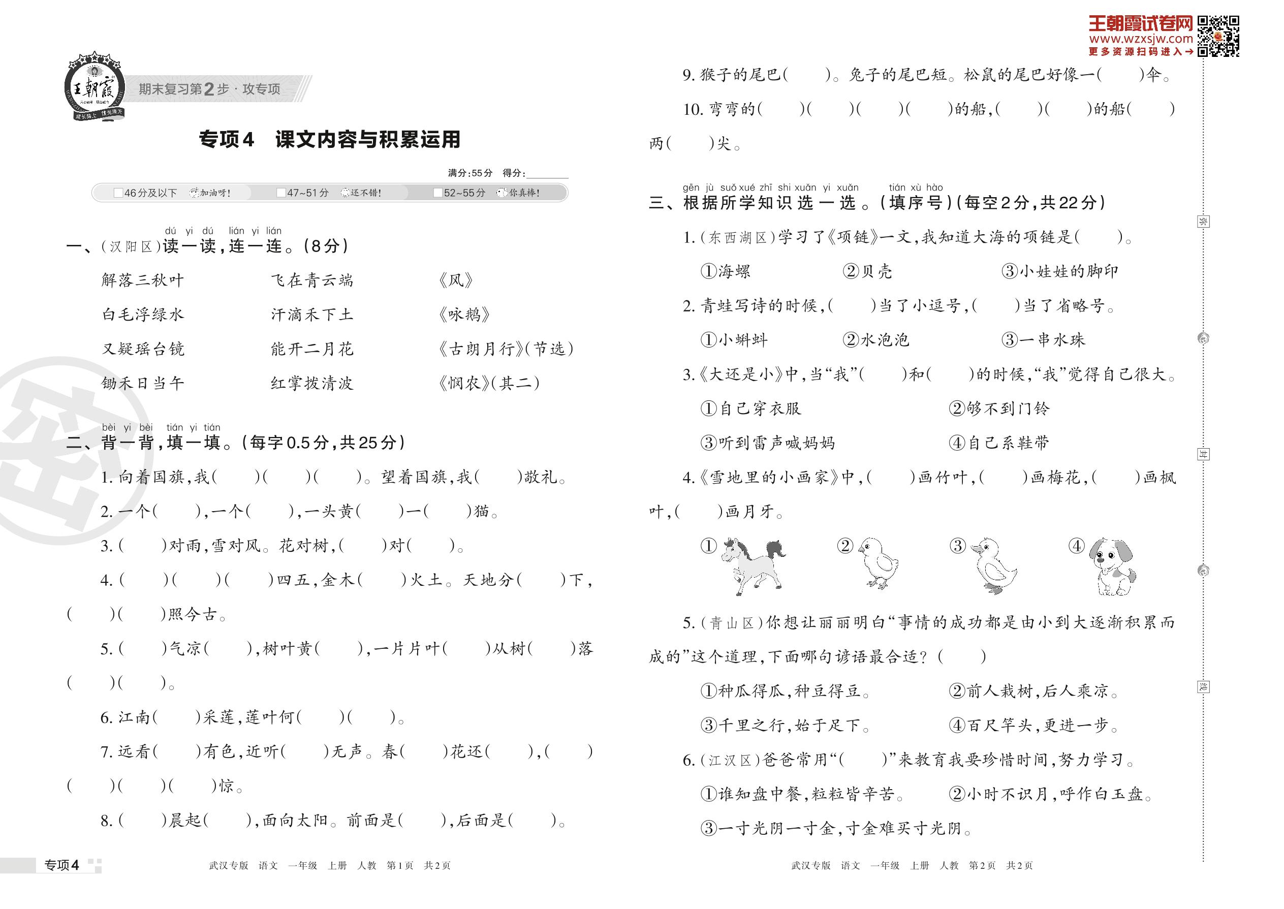 王朝霞期末专项卷——课文内容与积累运用一年级上册语文(人教版)_R221123145544257【4】