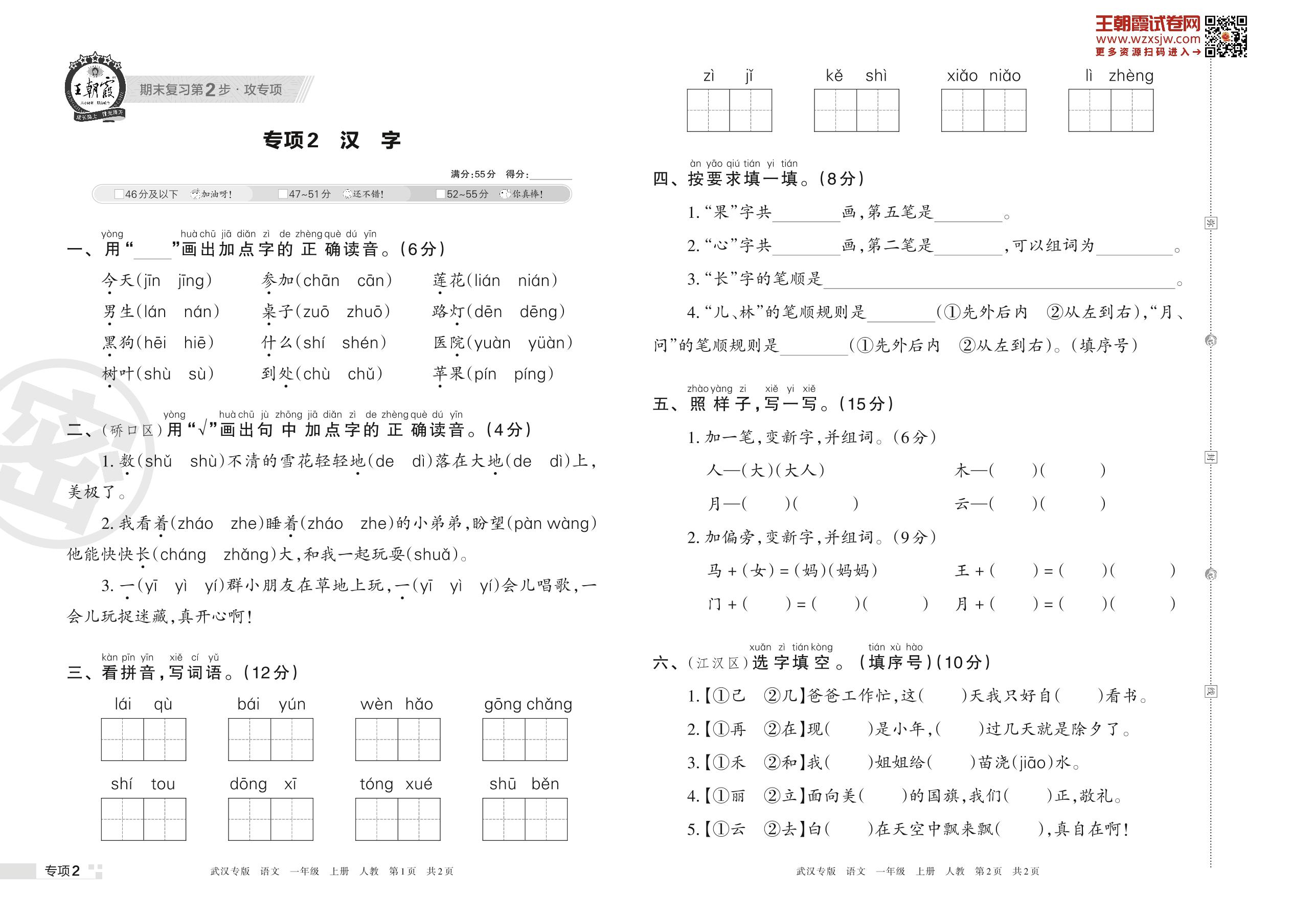 王朝霞期末专项卷——汉字一年级上册语文(人教版)_R221123145544315【2】
