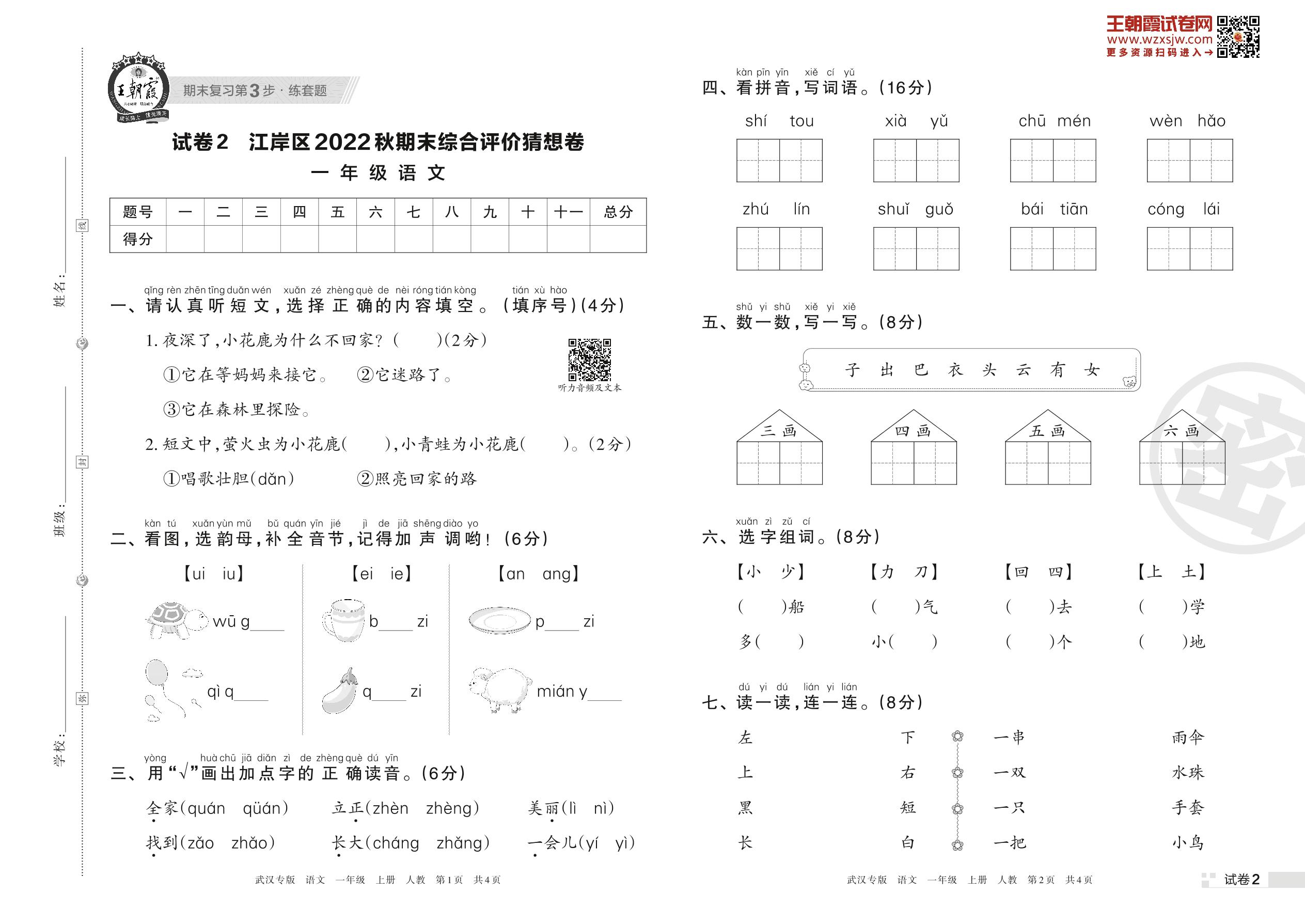 江岸区2022秋期末综合评价猜想卷一年级上册语文(人教版)【2】