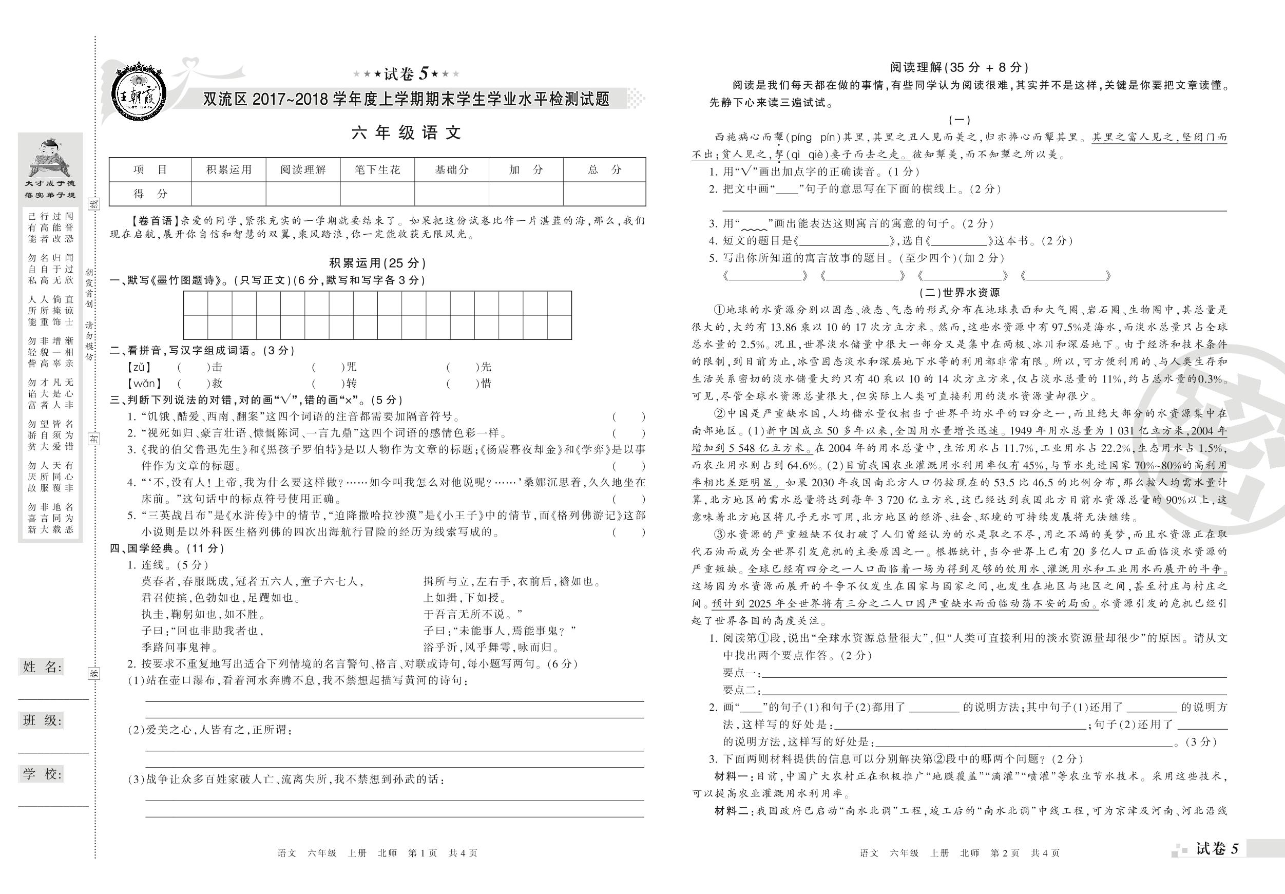 2017-2018学年第一学期成都市双流区六年级语文试卷(北师版)【5】