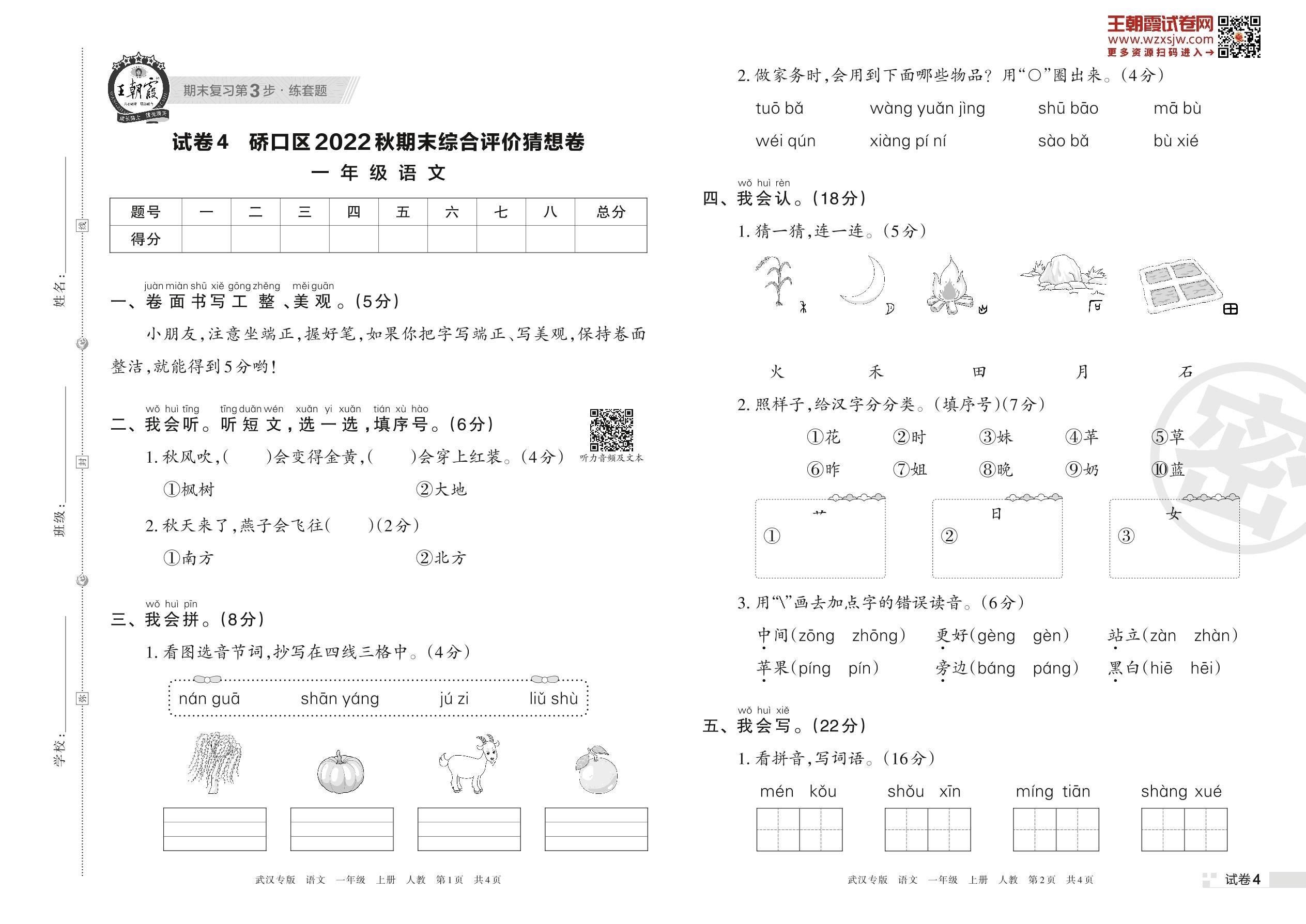 硚口区2022秋期末综合评价猜想卷一年级上册语文(人教版)【4】