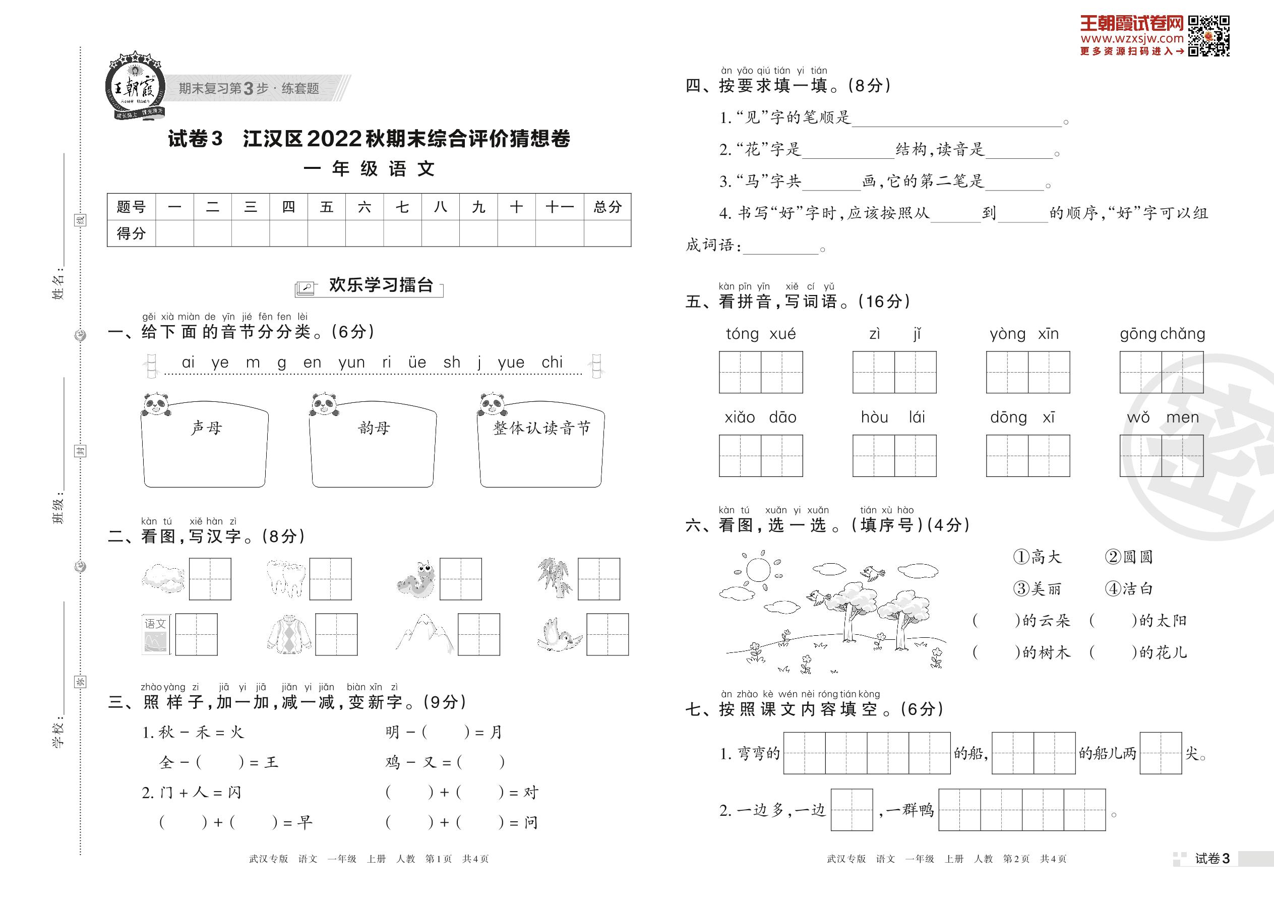 江汉区2022秋期末综合评价猜想卷一年级上册语文(人教版)【3】