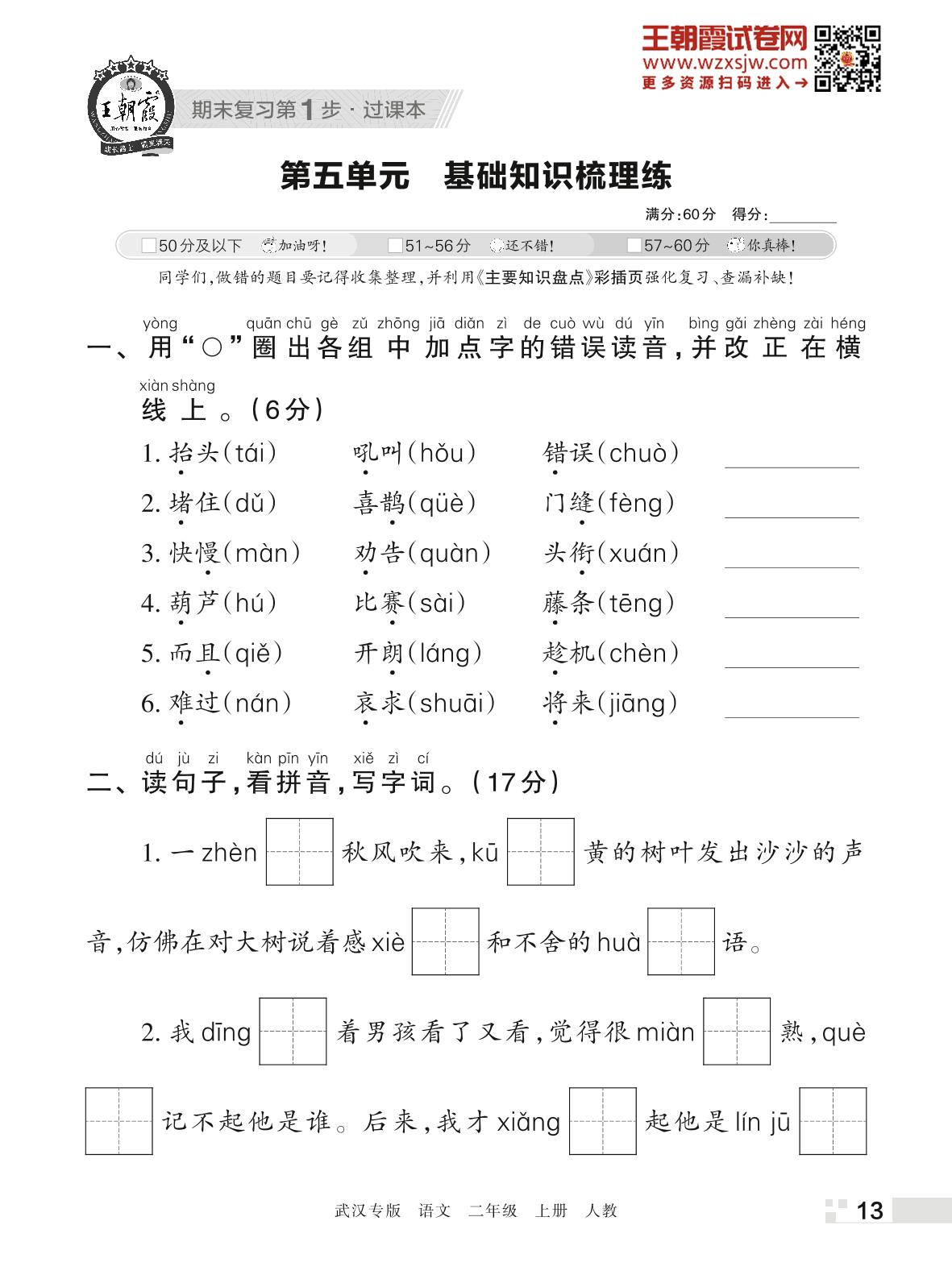 王朝霞期末过课本——第五单元 基础知识梳理练二年级上册语文(人教版)_R221123150219778