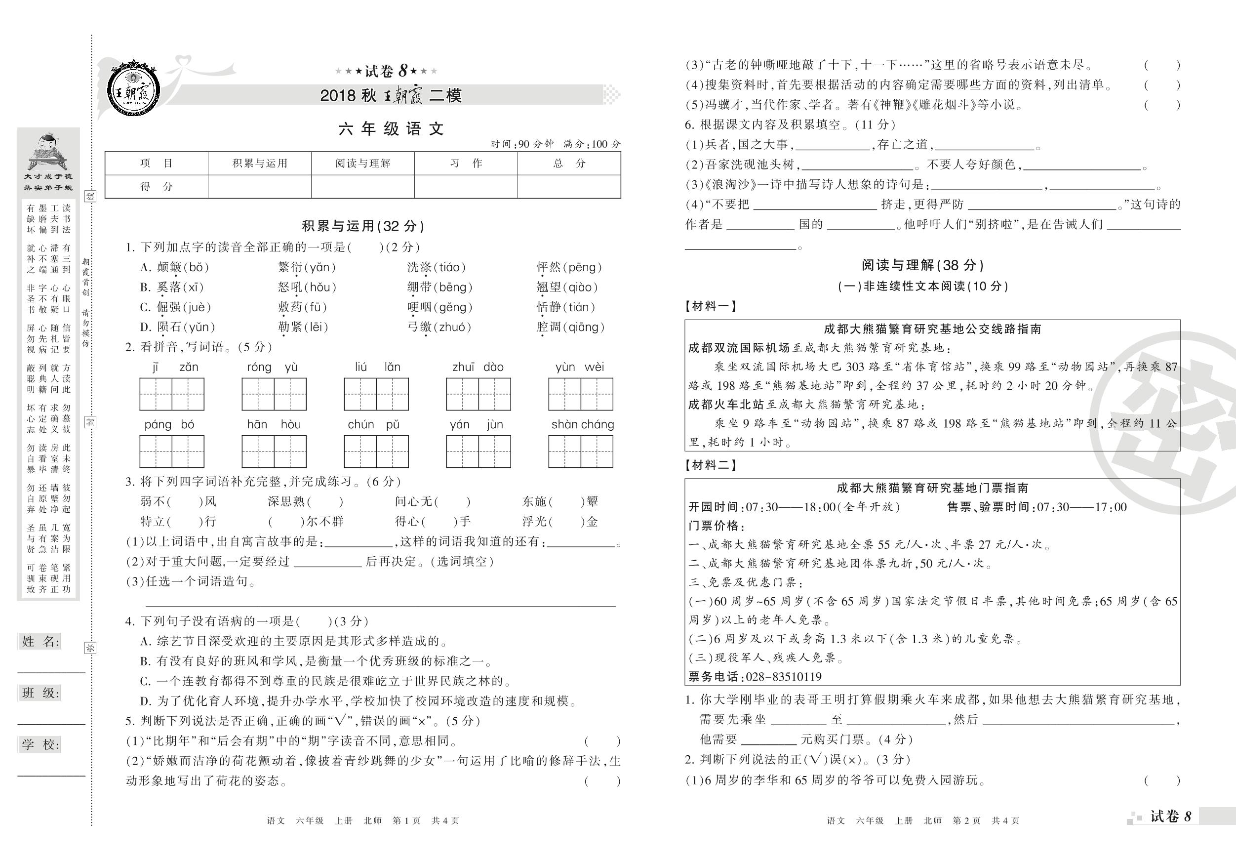 王朝霞期末模拟卷六年级上册语文(北师版)【8】