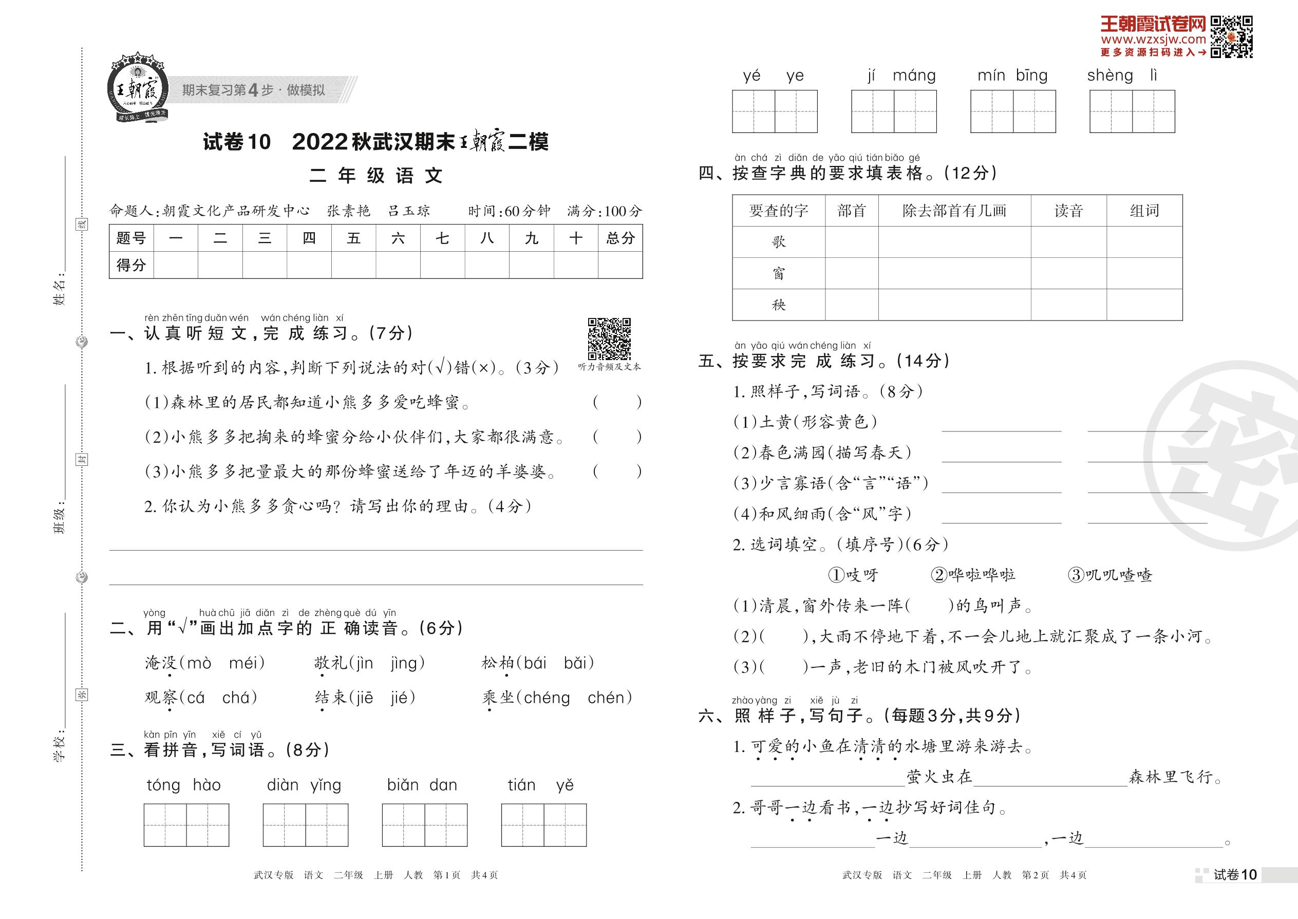 王朝霞期末模拟卷二年级上册语文(人教版)_R221123150221143【10】