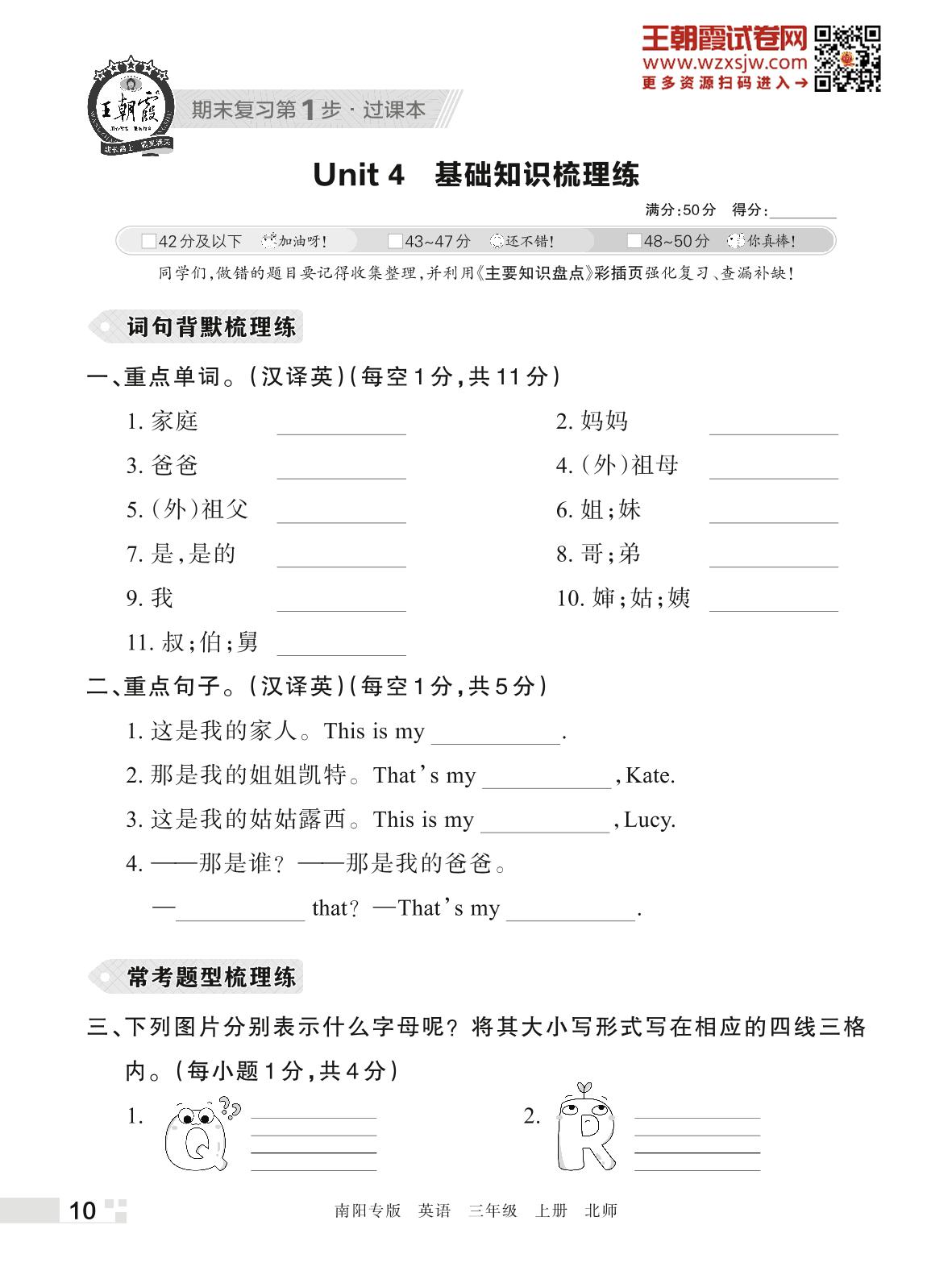 王朝霞期末过课本——Unit 4 基础知识梳理练三年级上册英语(北师版)