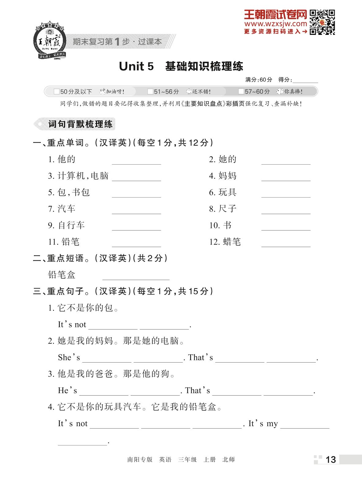 王朝霞期末过课本——Unit 5 基础知识梳理练三年级上册英语(北师版)
