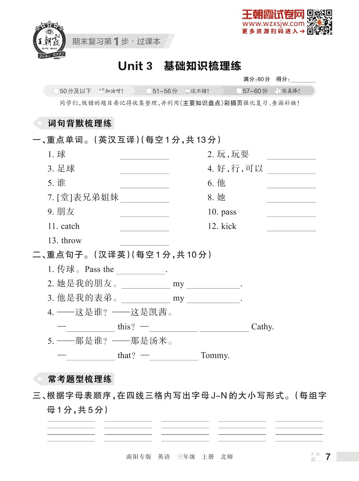 王朝霞期末过课本——Unit 3 基础知识梳理练三年级上册英语(北师版)