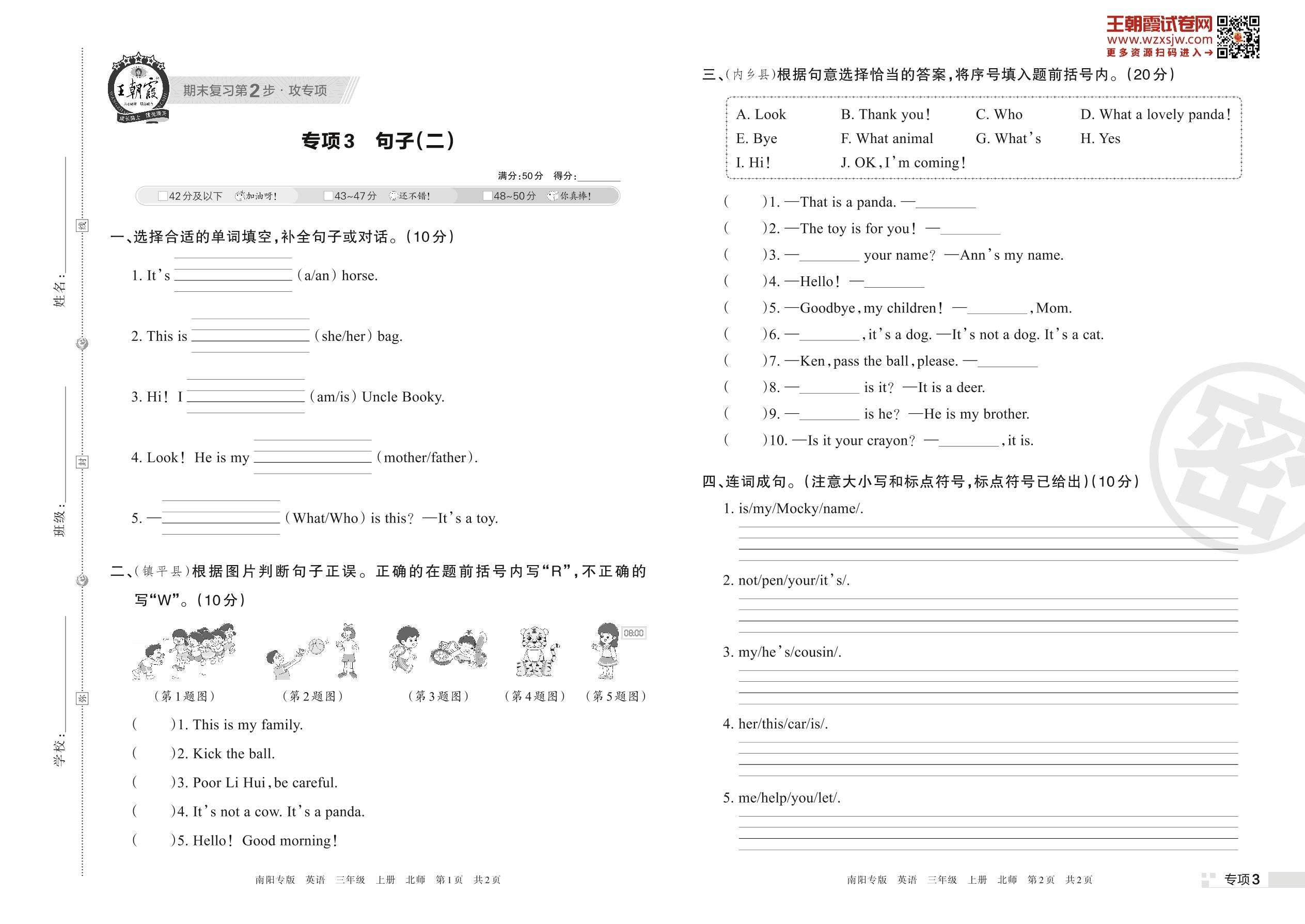 王朝霞期末专项卷——句子(二)三年级上册英语(北师版)【3】