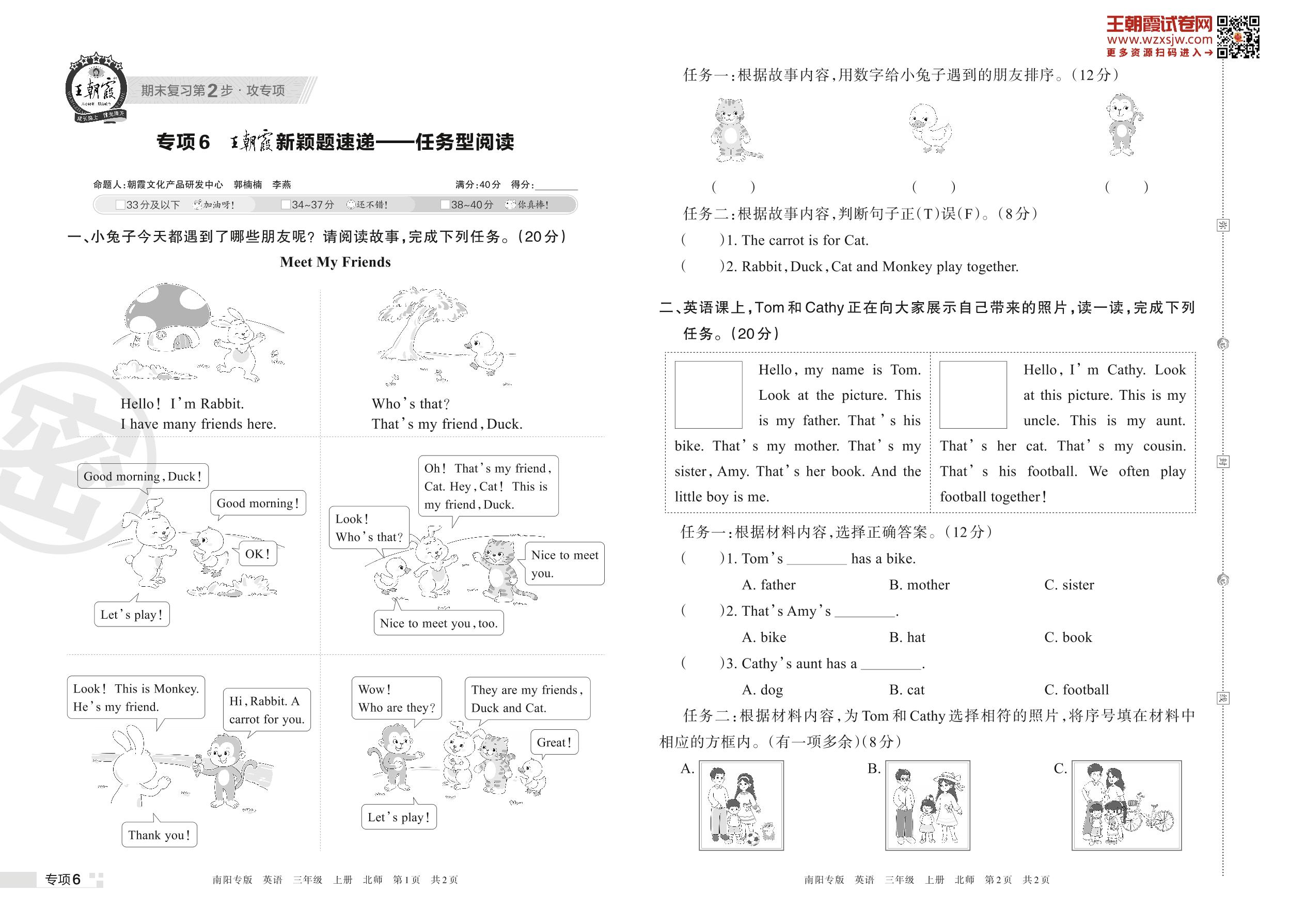 王朝霞期末专项卷——王朝霞新颖题速递:任务型阅读三年级上册英语(北师版)【6】