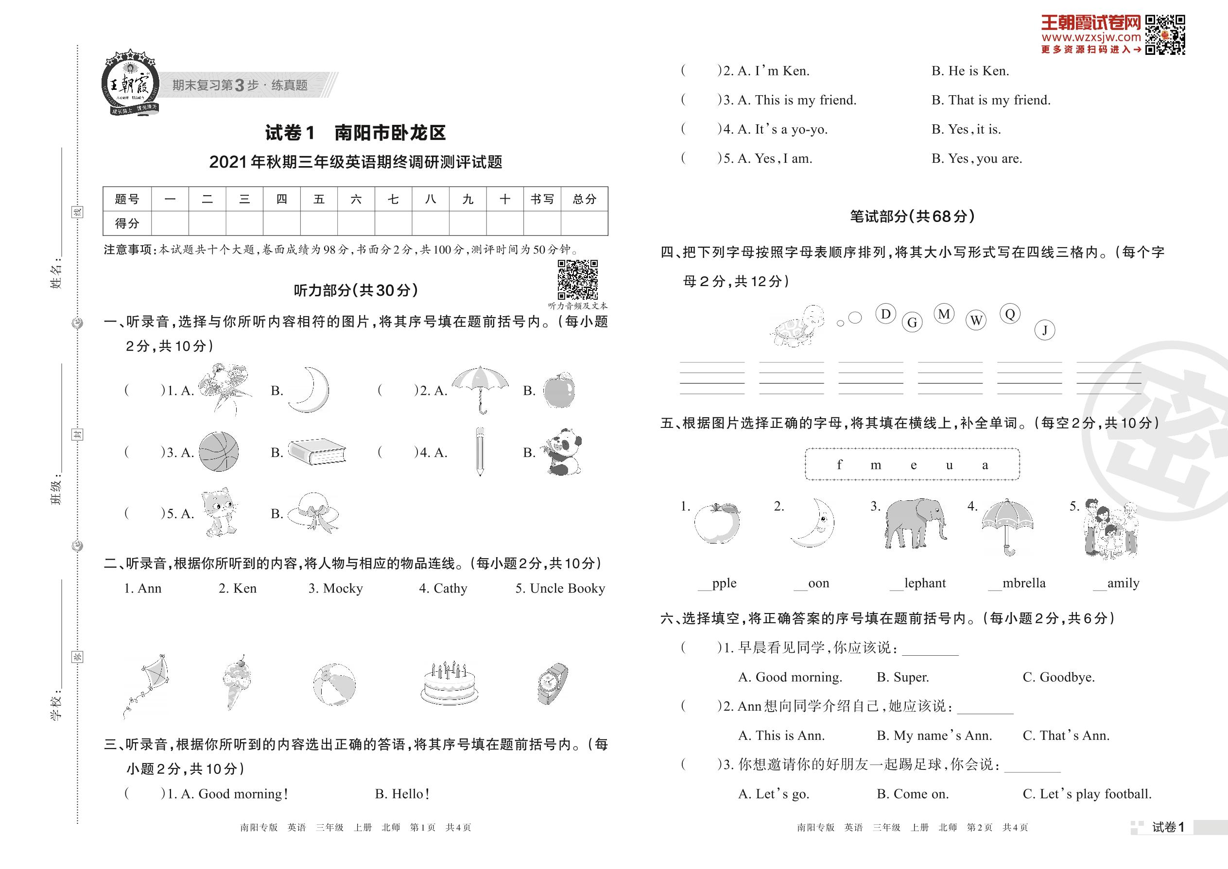 南阳市卧龙区2021年秋期三年级英语期终调研测评试题(北师版)【1】