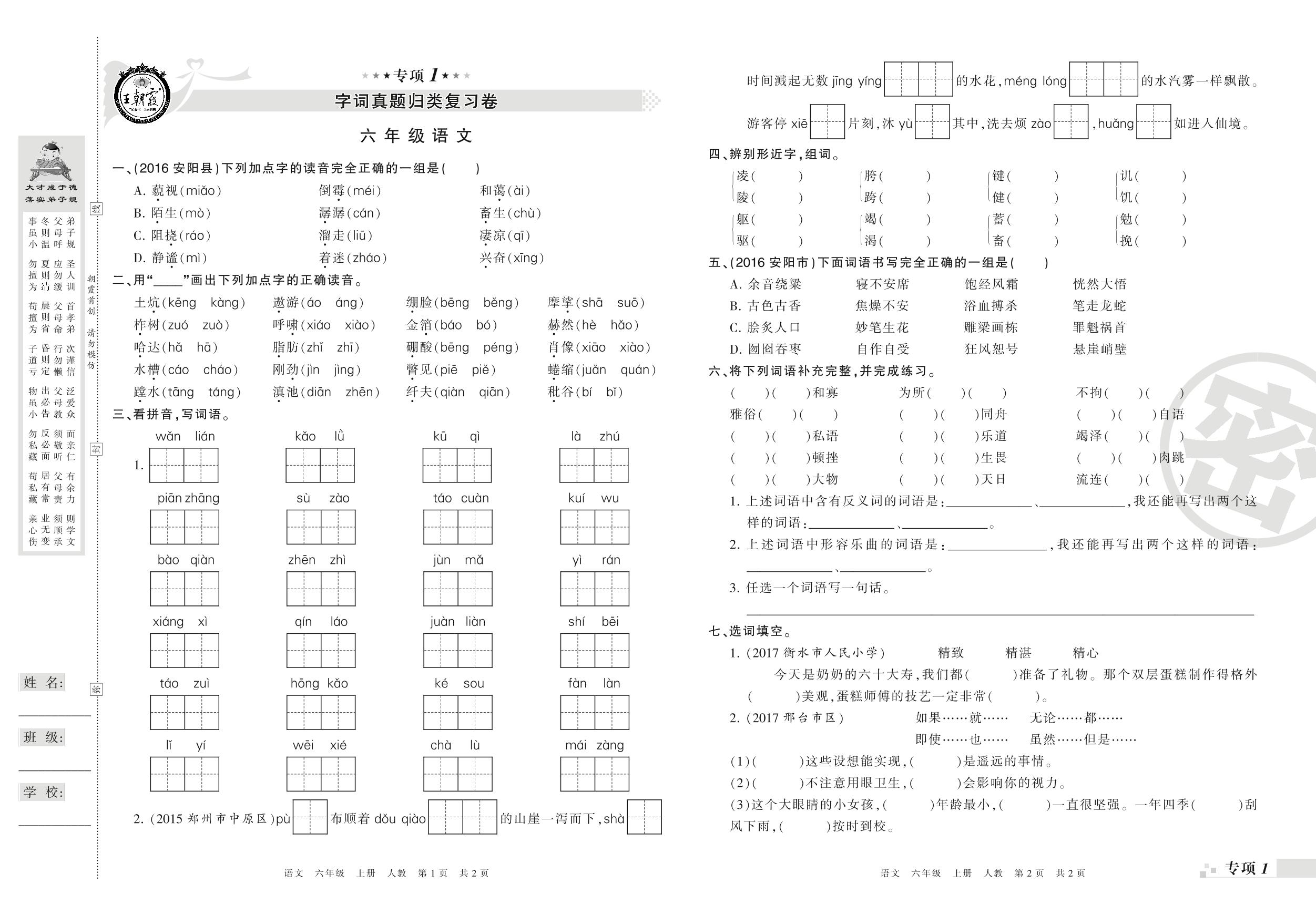 王朝霞期末专项卷——字词真题归类复习卷六年级上册语文(人教版)_R210802115257【0】