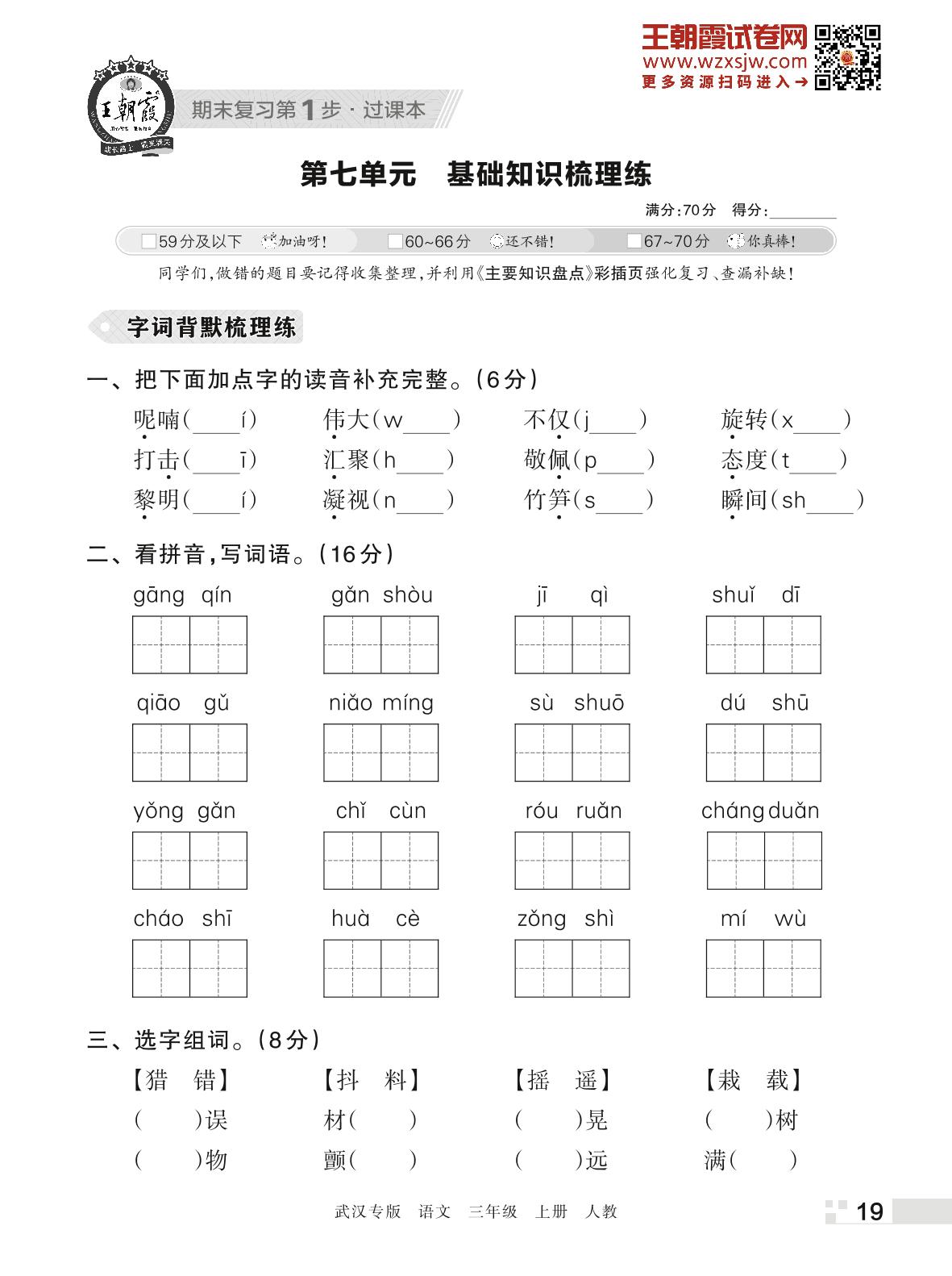 王朝霞期末过课本——第七单元 基础知识梳理练三年级上册语文(人教版)_R221123150835363